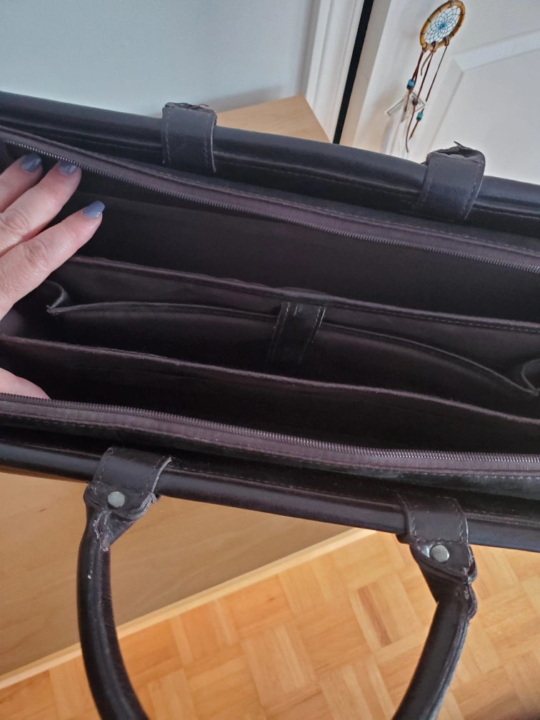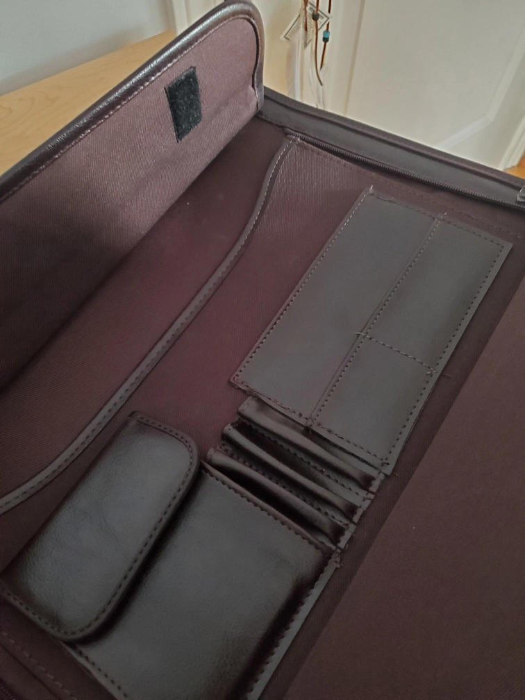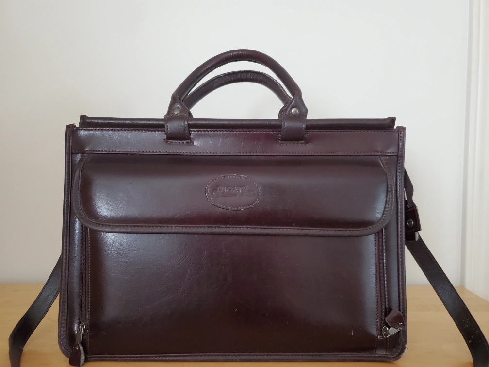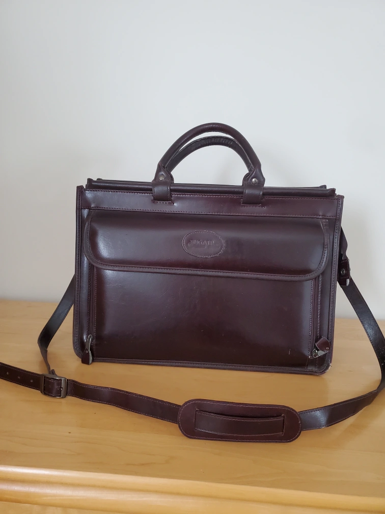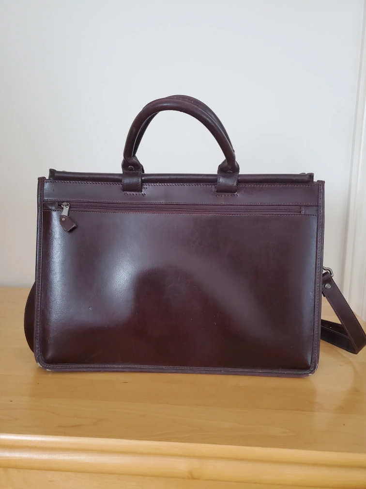 344Brown leather briefcase with a long shoulder strap and two top handles. The briefcase has an exterior front pocket and is zippered closed.