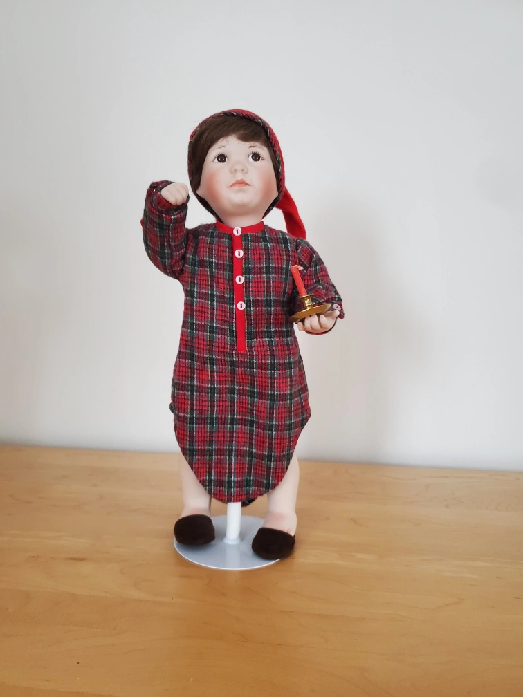 Meet Nathan! This is a porcelain doll in a red plaid nightshirt. He has a red cap with a white trim and is holding a small candle.