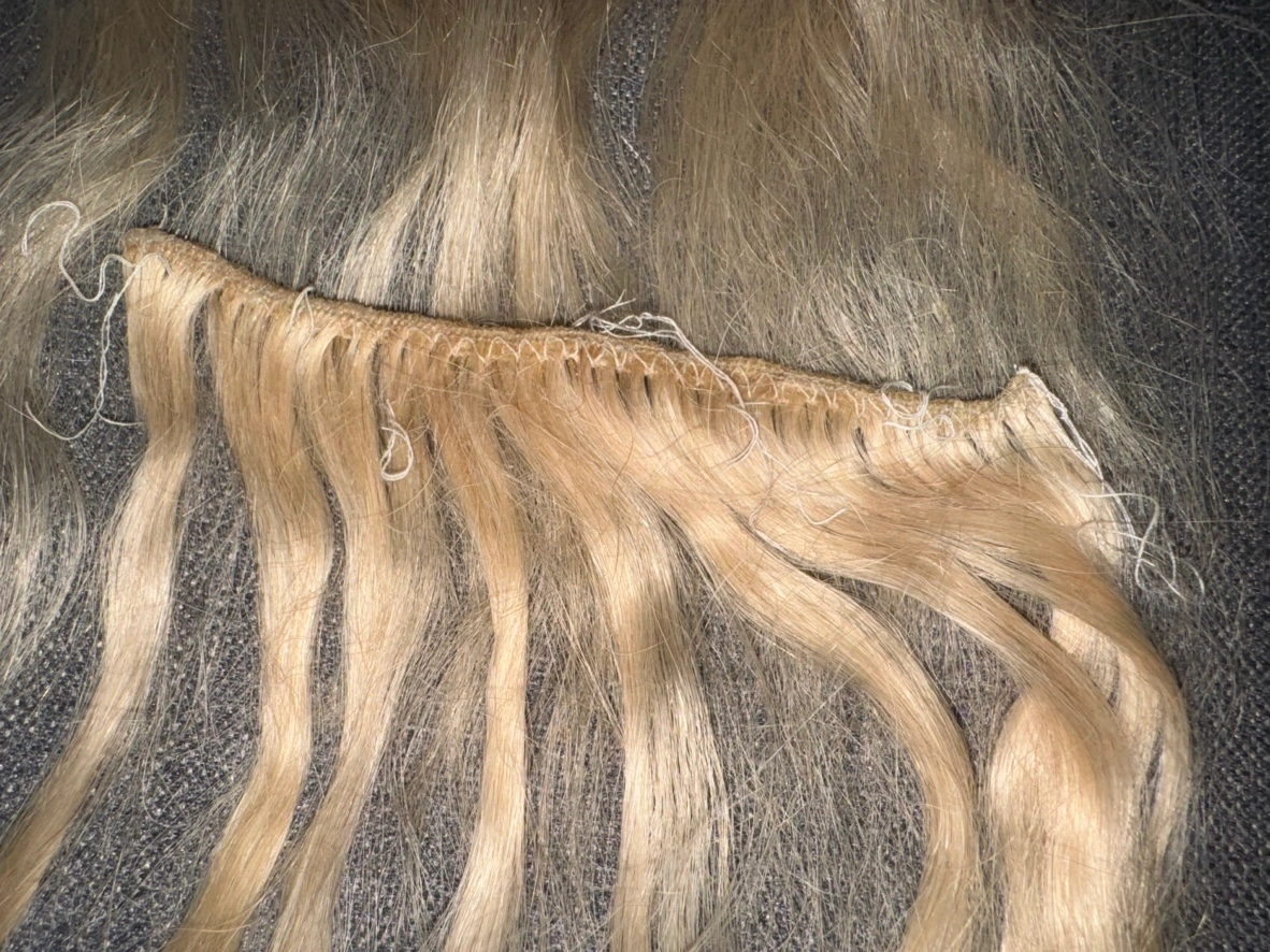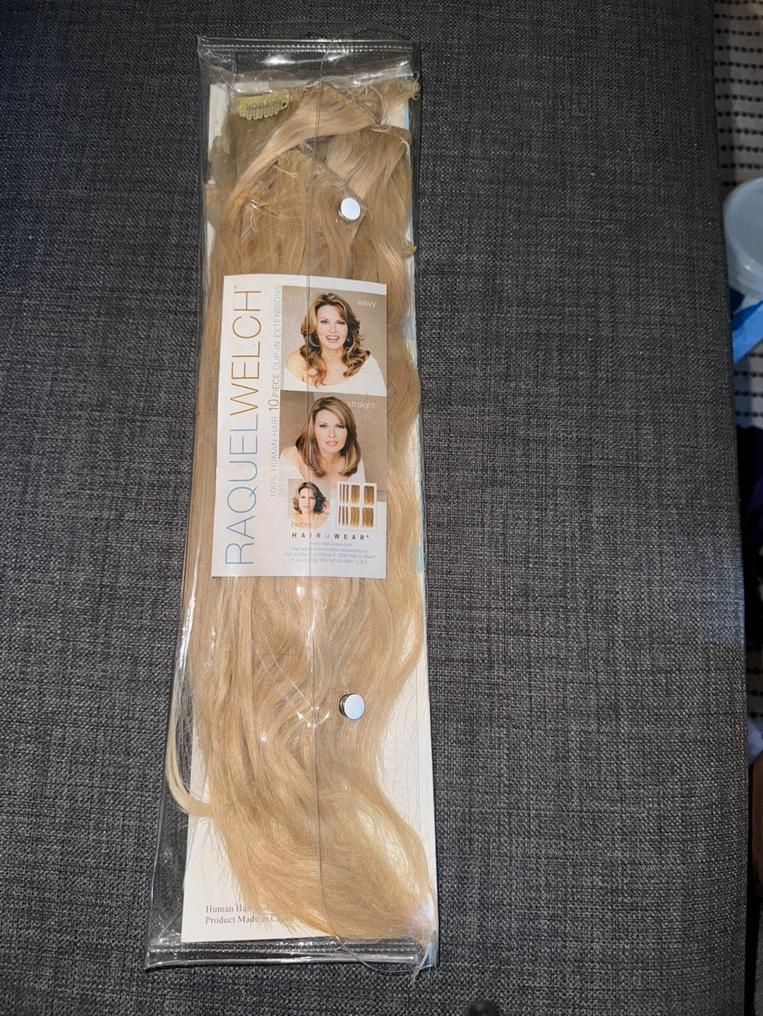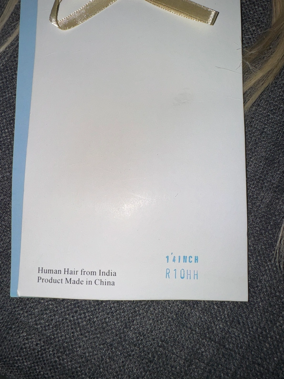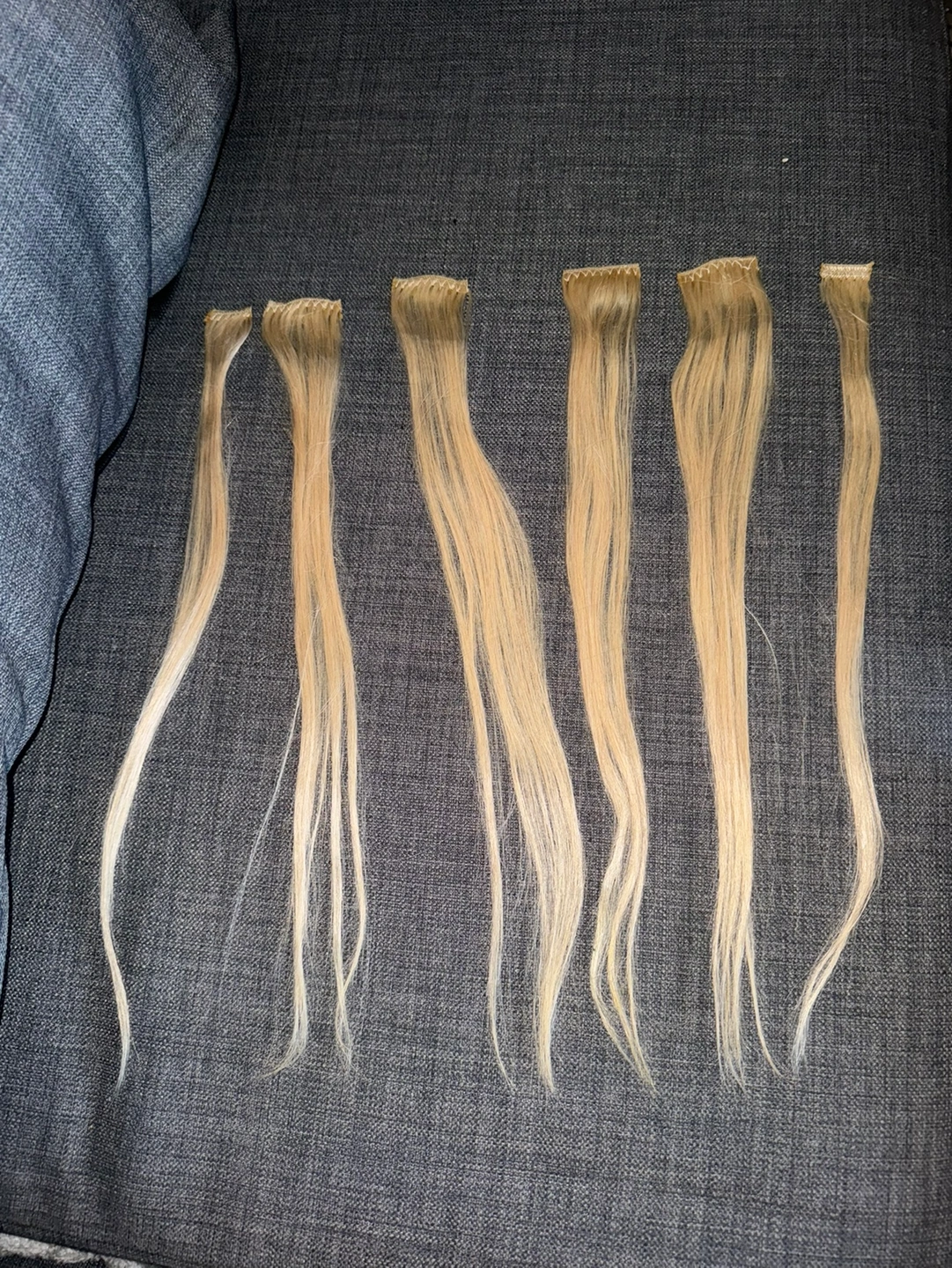 14” long, 10 piece clip in extensions (only 4 pieces have clips). Clips were removed from other pieces as we used the pieces for a weave. Don’t have the clips that were removed.