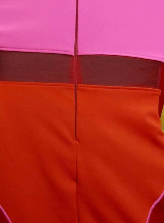 The sheer power mesh of this Adidas X IVY PARK Catsuit stands out against contrast panels in different shades of pink and red, creating a statement piece that accentuates the body.
