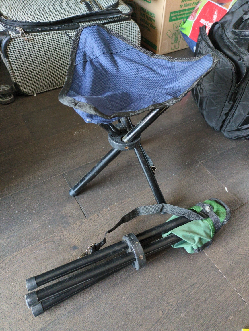 Compact folding stool with carrying strap. Perfect for camping, sporting events, or any other outdoor activity.