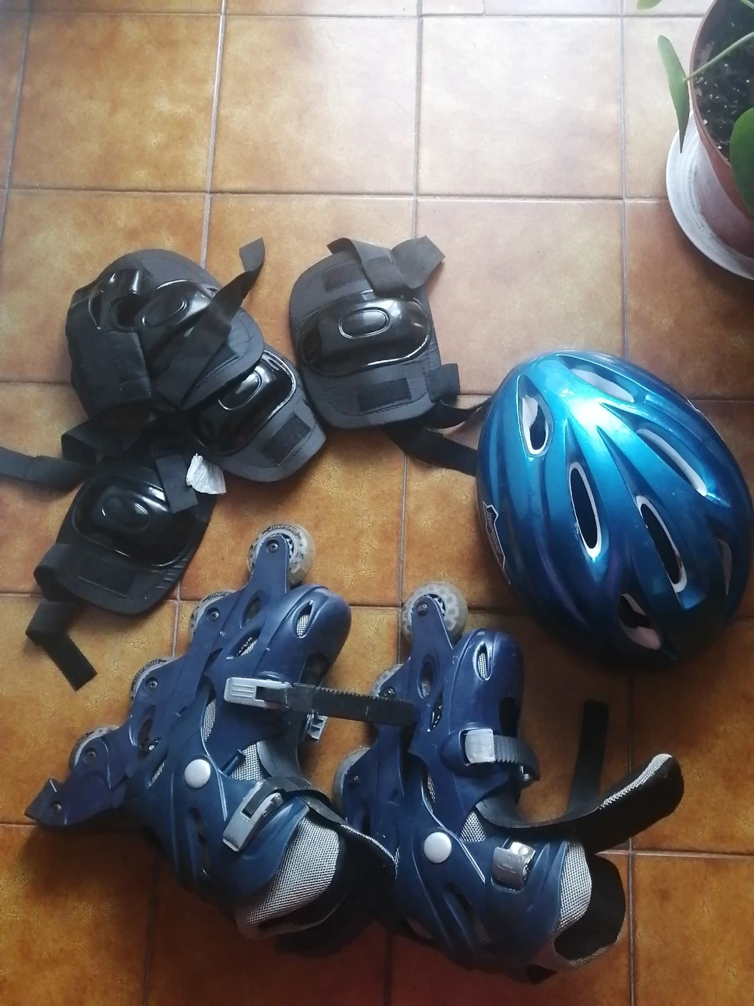 size adjustable rollerblades from 35-37cm , helmet, and arm and knee pads. All in blue and black colours. Includes 2 knee pads, 2 elbow pads, and 1 pair of wrist guards.