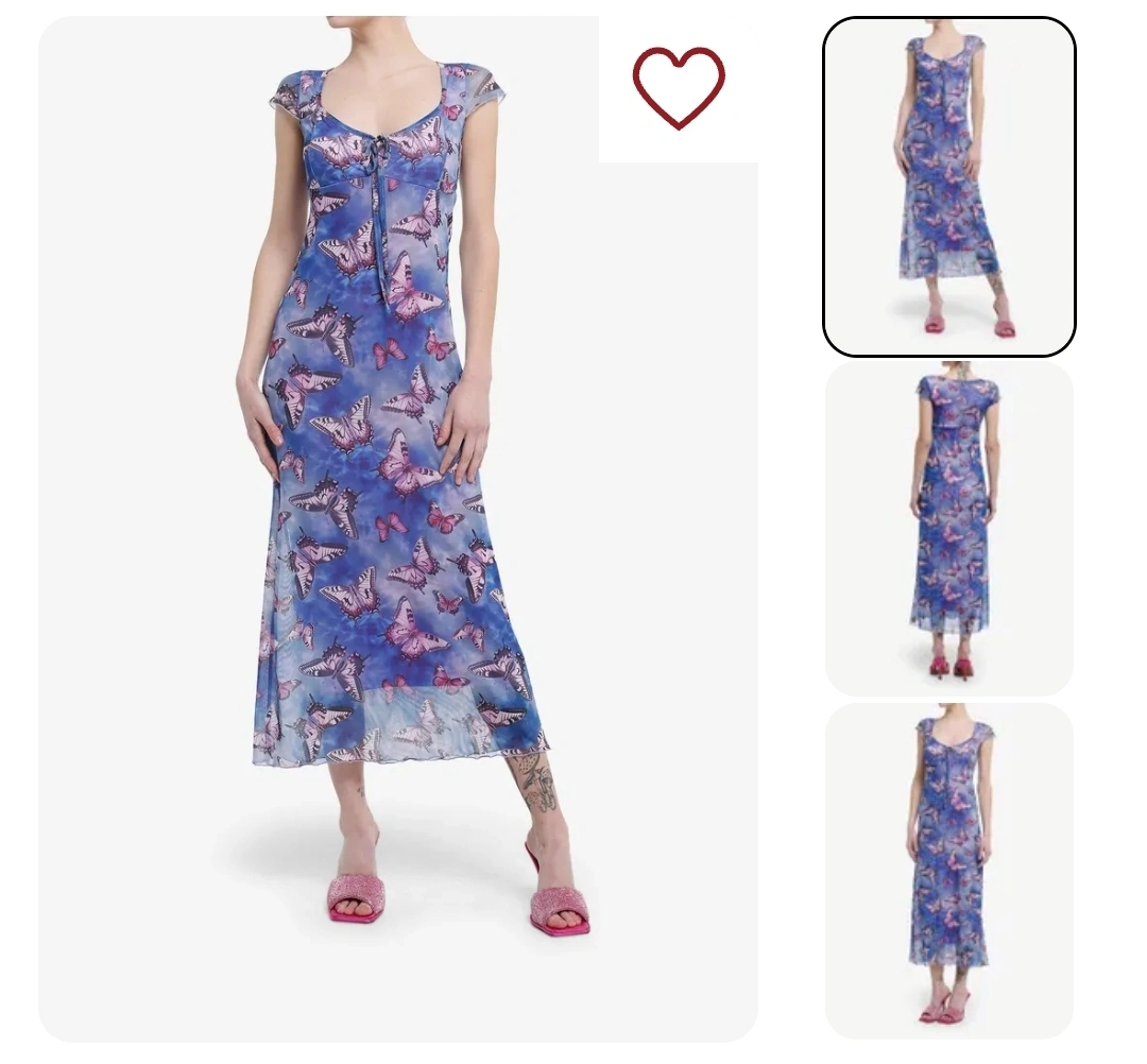 "This gorgeous midi dress is ready to flutter into your wardrobe! It features a sky blue background printed all over the mesh outer layer, with pink butterflies of varying sizes. Comes with a sweetheart neckline and cap sleeves, plus an empire waist and tie straps at the center chest."