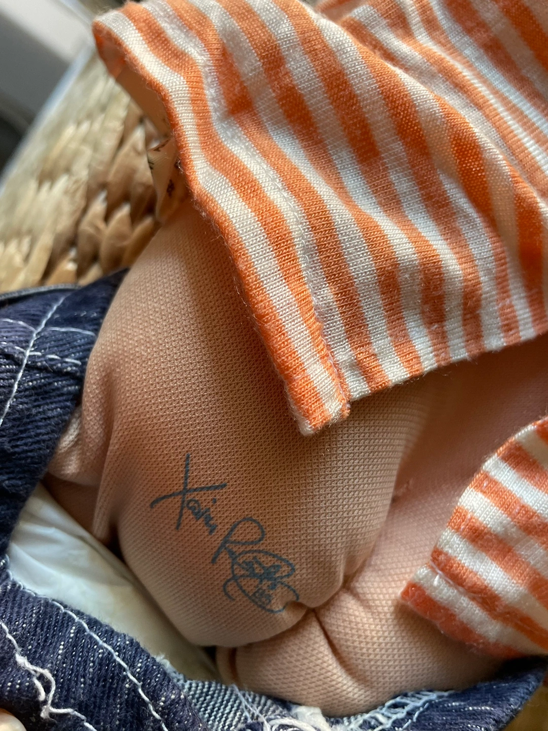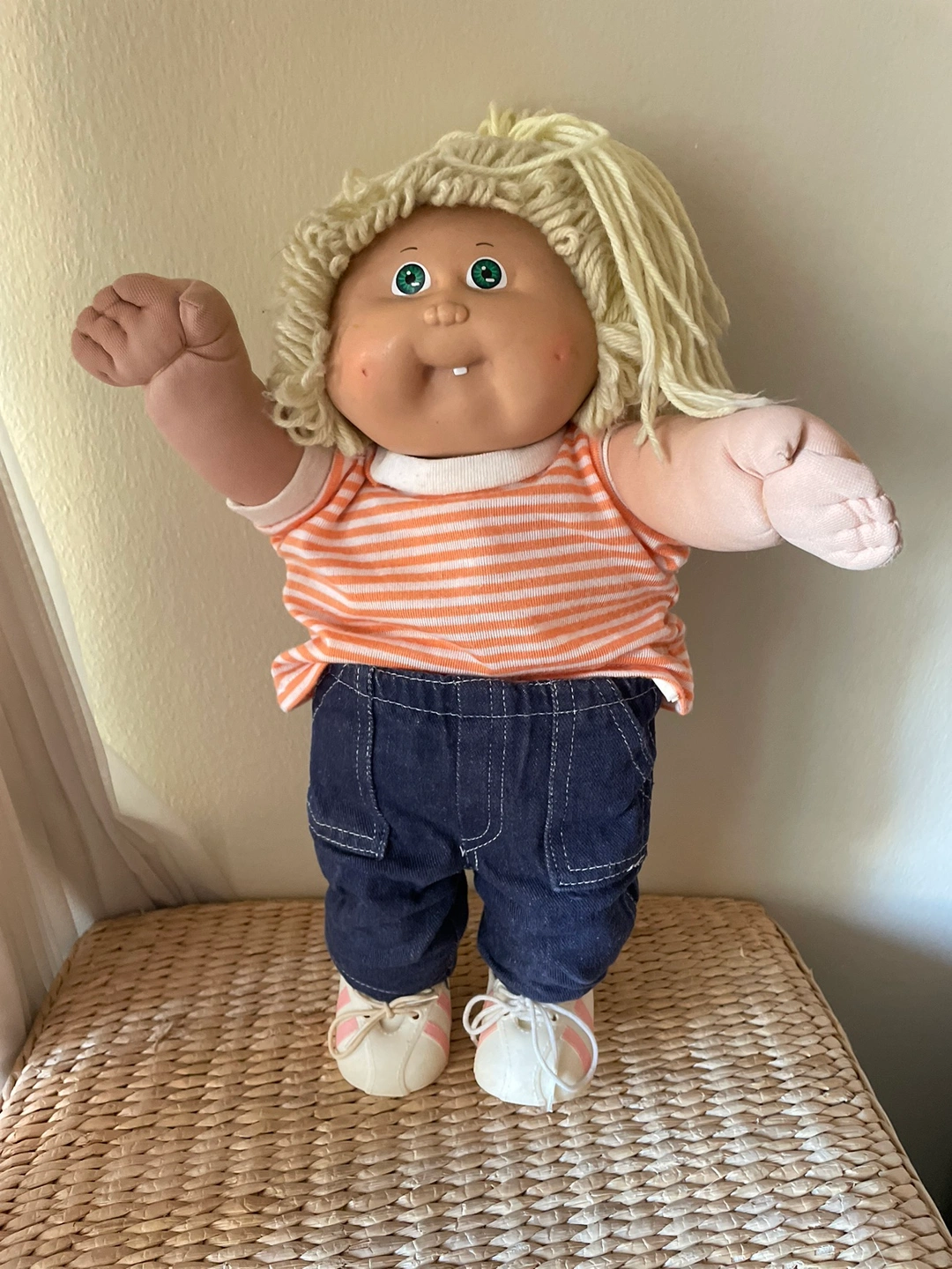 Original 1983 Coleco Cabbage Patch doll. She has one tooth, yellow blonde hair, green eyes, two dimples and is dressed in original Cabbage Patch branded jeans, and Coleco branded shirt. Her running shoes are original as well and they have two pink stripes on both sides of the shoes - they’re a bit sticky from age.