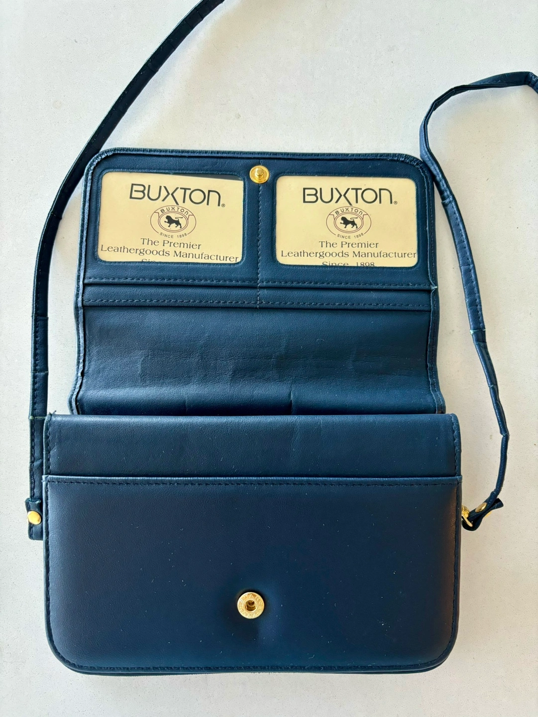 The vintage navy blue genuine soft leather crossbody purse with a gold clasp by Buxton has multiple pockets, card slots inside, and a zippered compartment; And a separate card holders inside or use separately. A regular iPhone fits great inside. Removable strap and very light weight. 7.5β W x5 1/4β when closed.