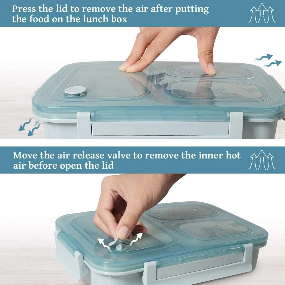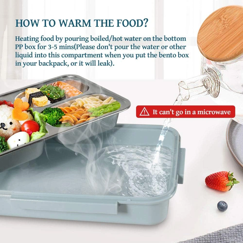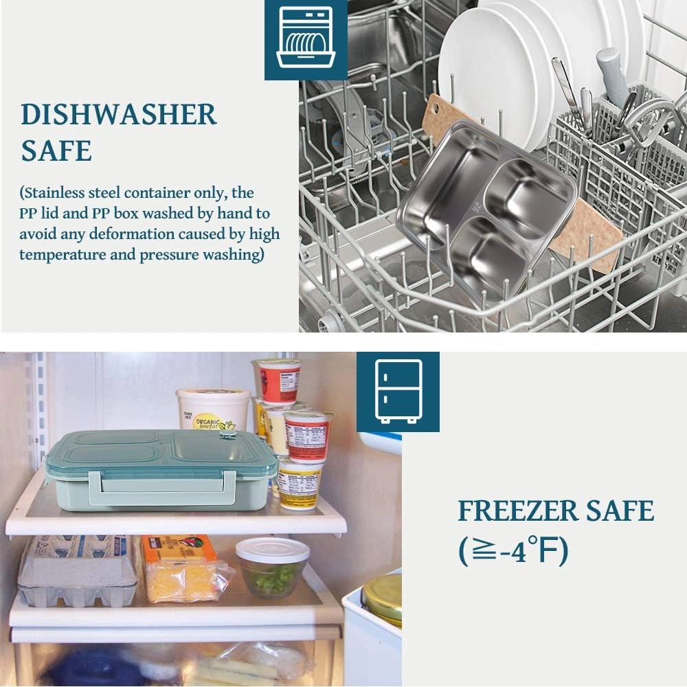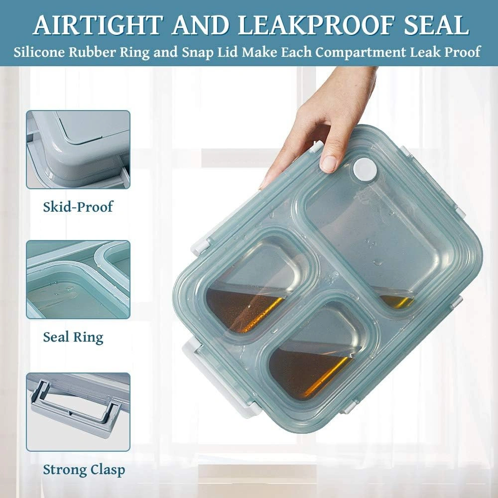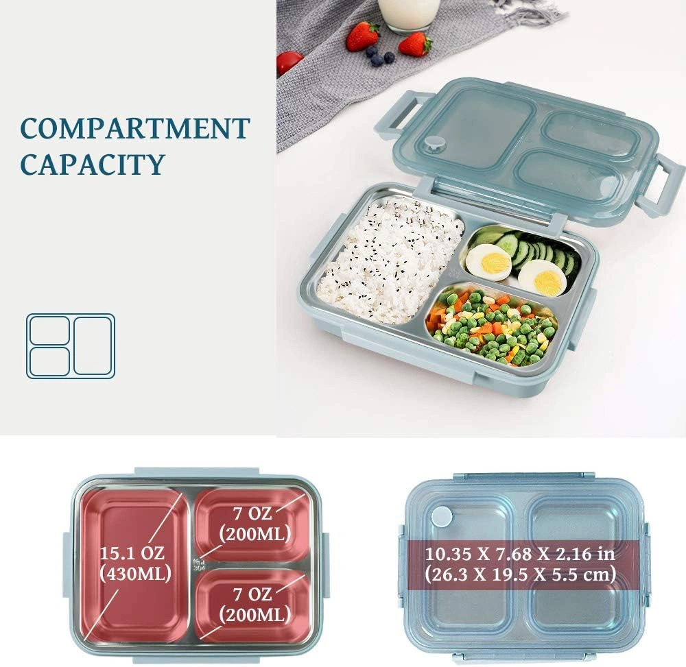 3 compartments, leak proof to prevent mixing of food. 430 ml, 200 ml, and 200 ml.