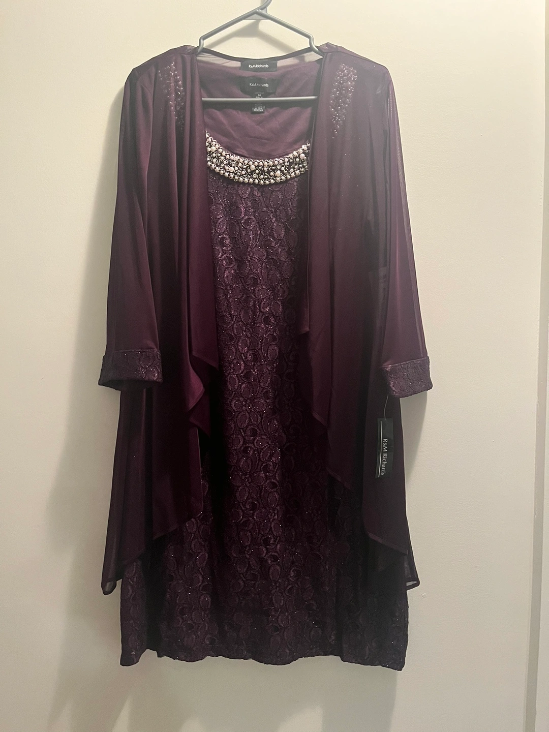 Brand new with tags! Pickup Brampton or Downtown Toronto PTP 18.5” approximately (21” with stretch) Cardigan: three-quarter length sleeves Dress: scoopneck with beaded details, sleeveless Details from website: Fabric type Jacket: 100% Polyester; Cuffs: 69% Nylon, 29% Polyester, 2% Spandex; Dress: 69% Nylon, 29% Polyester, 2% Spandex; Lining: 100% Polyester Closure type: Zipper About this item: mother of the bride formal special occasion dress elegant and classic bridesmaid below the knee Description two piece flyaway three quarter sleeve sheer jacket over a shift dress with a beaded bodice neckline