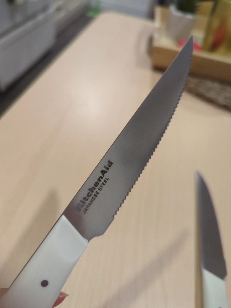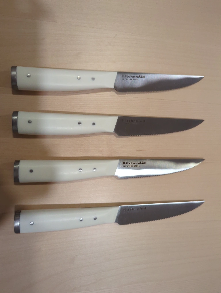 Set of 4 KitchenAid steak knives with white handles. They are all in new condition.