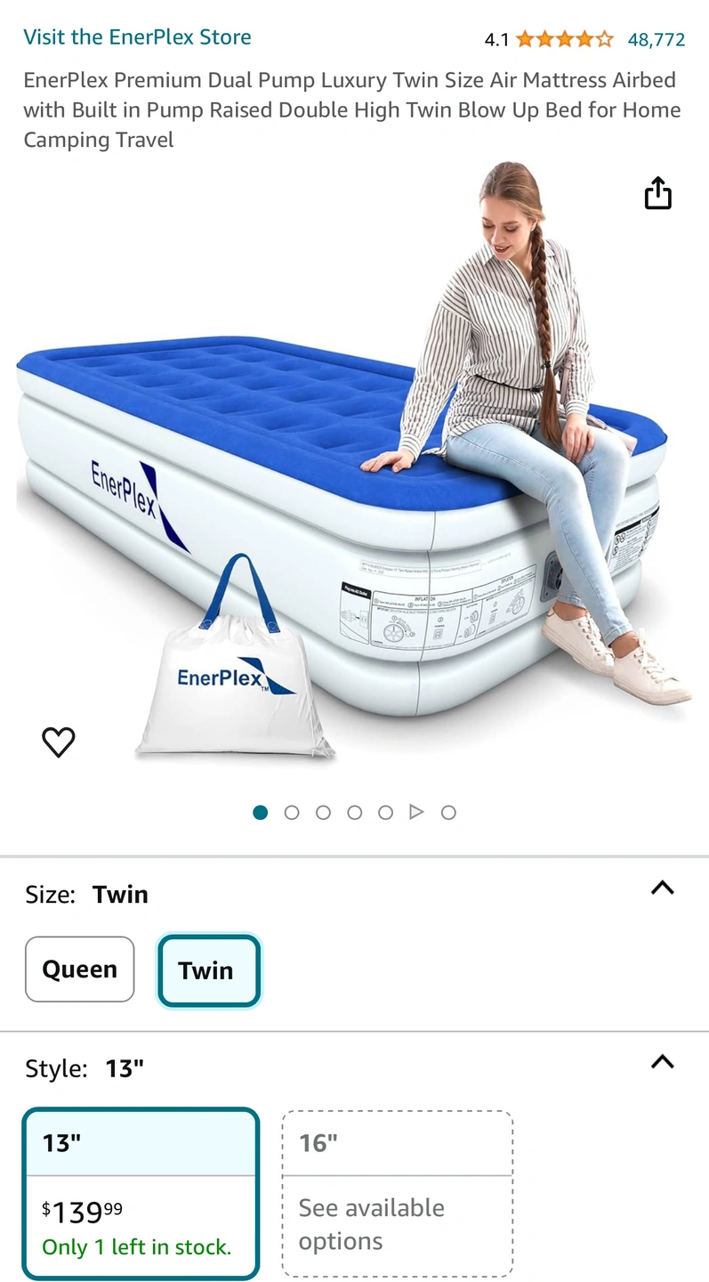 I’m selling an Enerplex Air Mattress Queen and Twin Size with Built in Pump. Brand new never used.