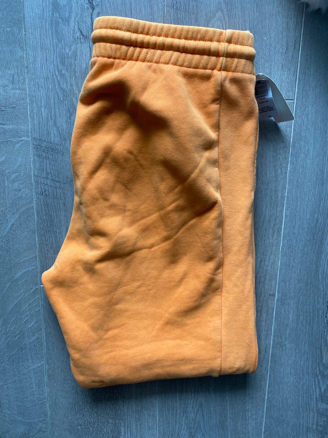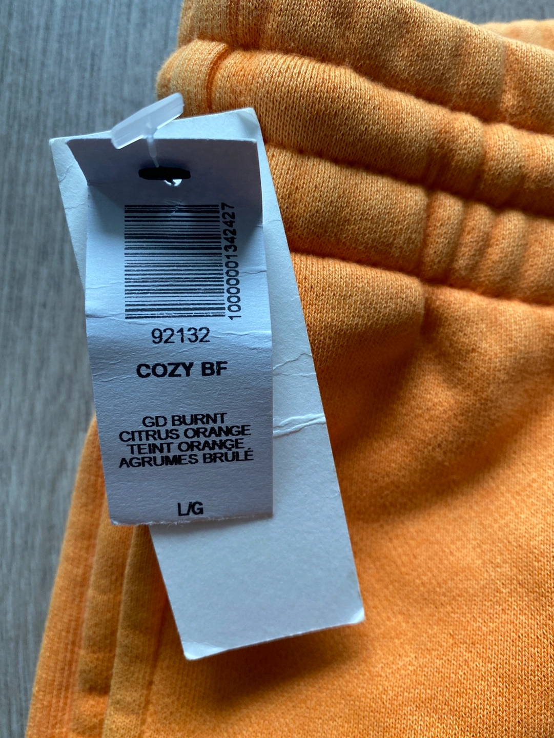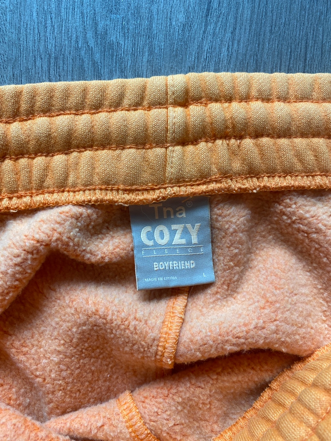 These are boyfriend-fit sweatpants in colour Burnt Citrus Orange with inseam pockets and an elastic waist and cuffs. They’re made with Tna’s Cozy Fleece — premium, midweight fleece. Drawcord waist. Ribbed side panels. Machine washable. Unworn with tags. Excellent condition, no visible flaws.