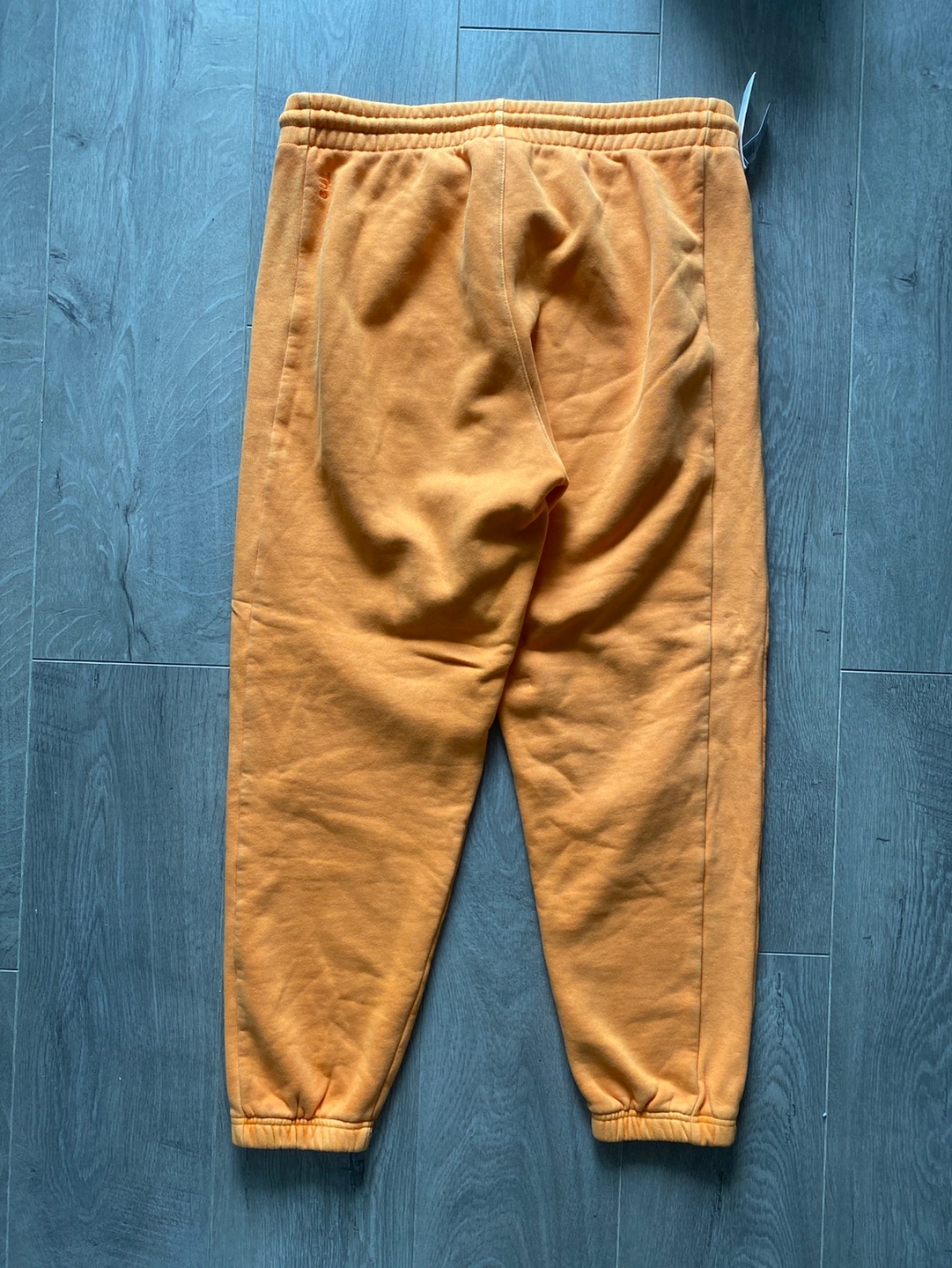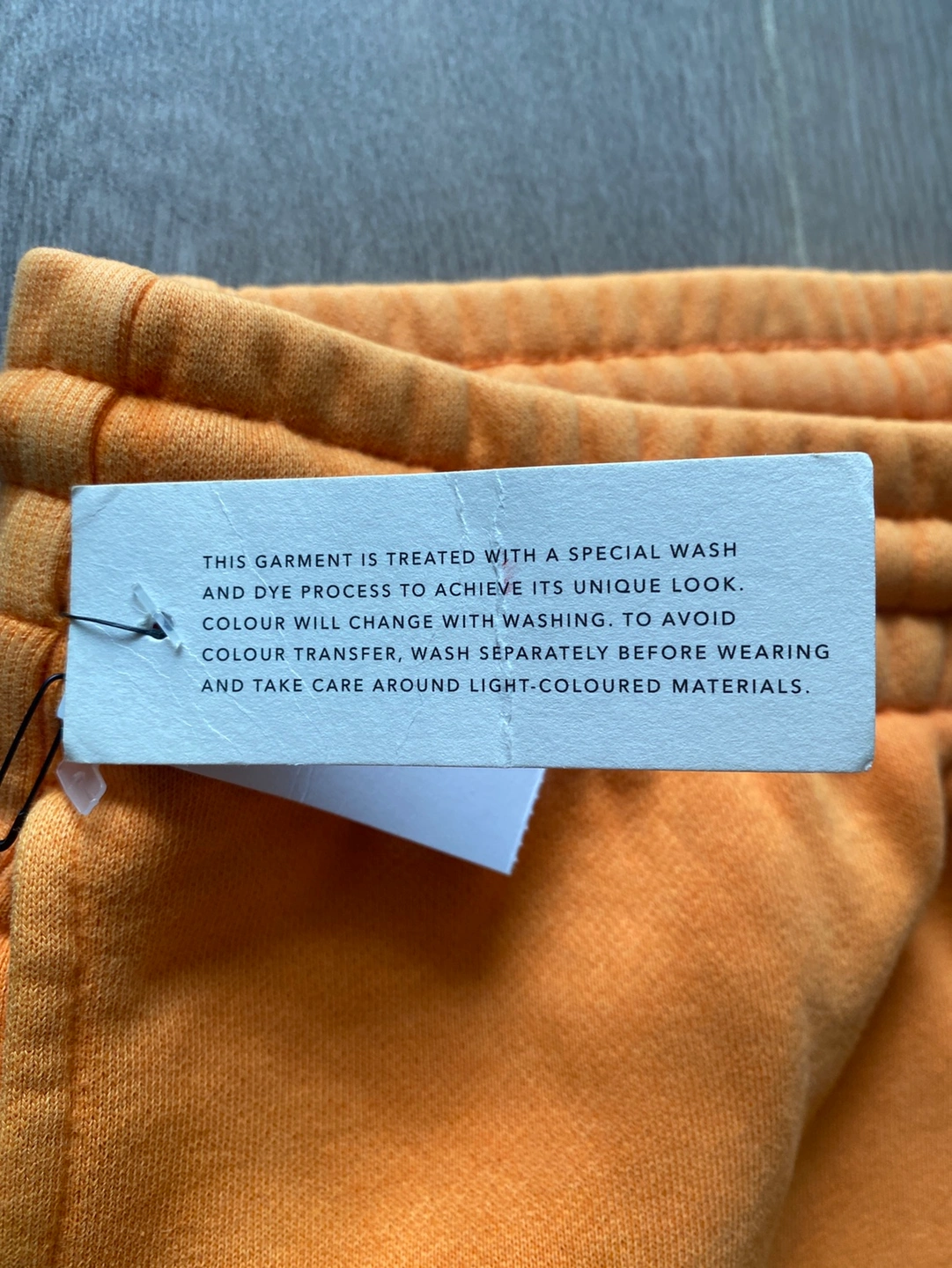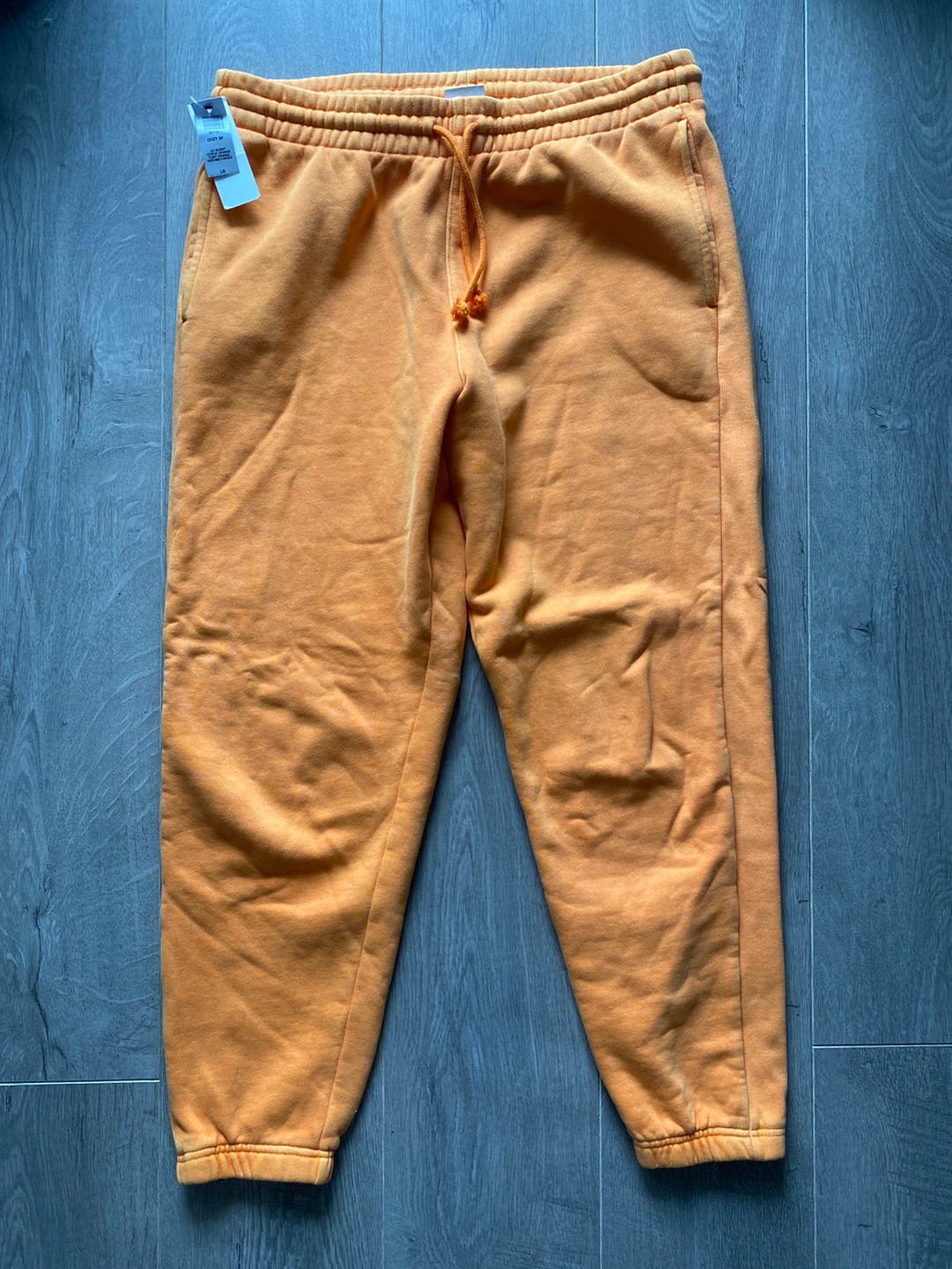 These are boyfriend-fit sweatpants in colour Burnt Citrus Orange with inseam pockets and an elastic waist and cuffs. They’re made with Tna’s Cozy Fleece — premium, midweight fleece. Drawcord waist. Ribbed side panels. Machine washable. Unworn with tags. Excellent condition, no visible flaws.