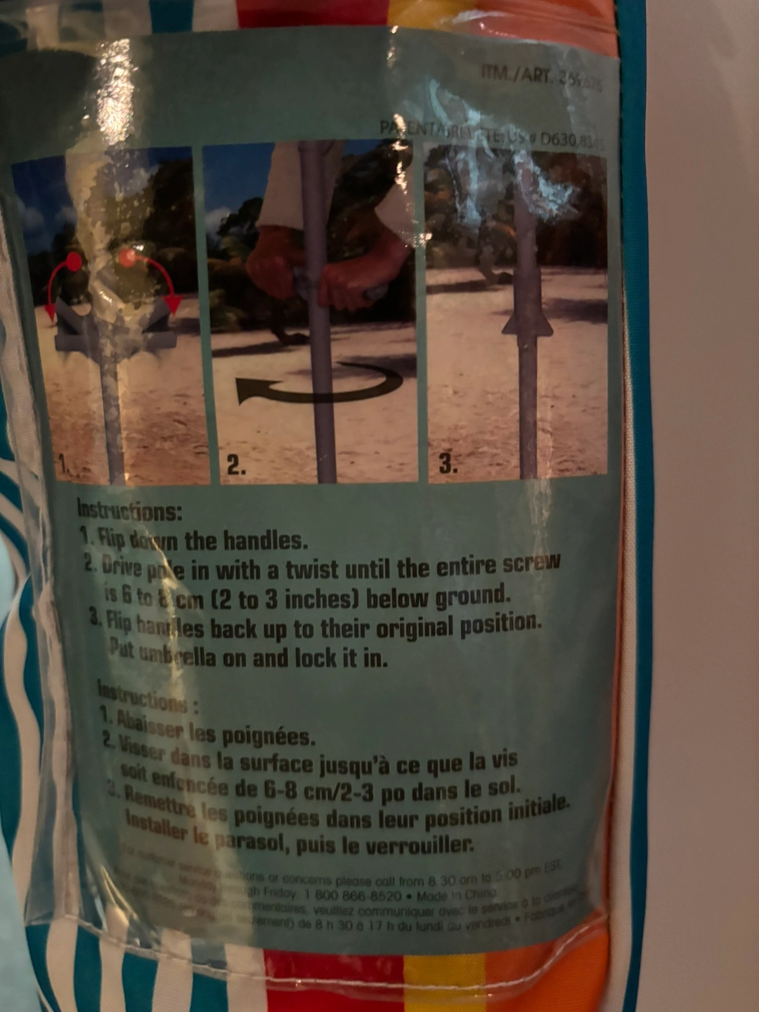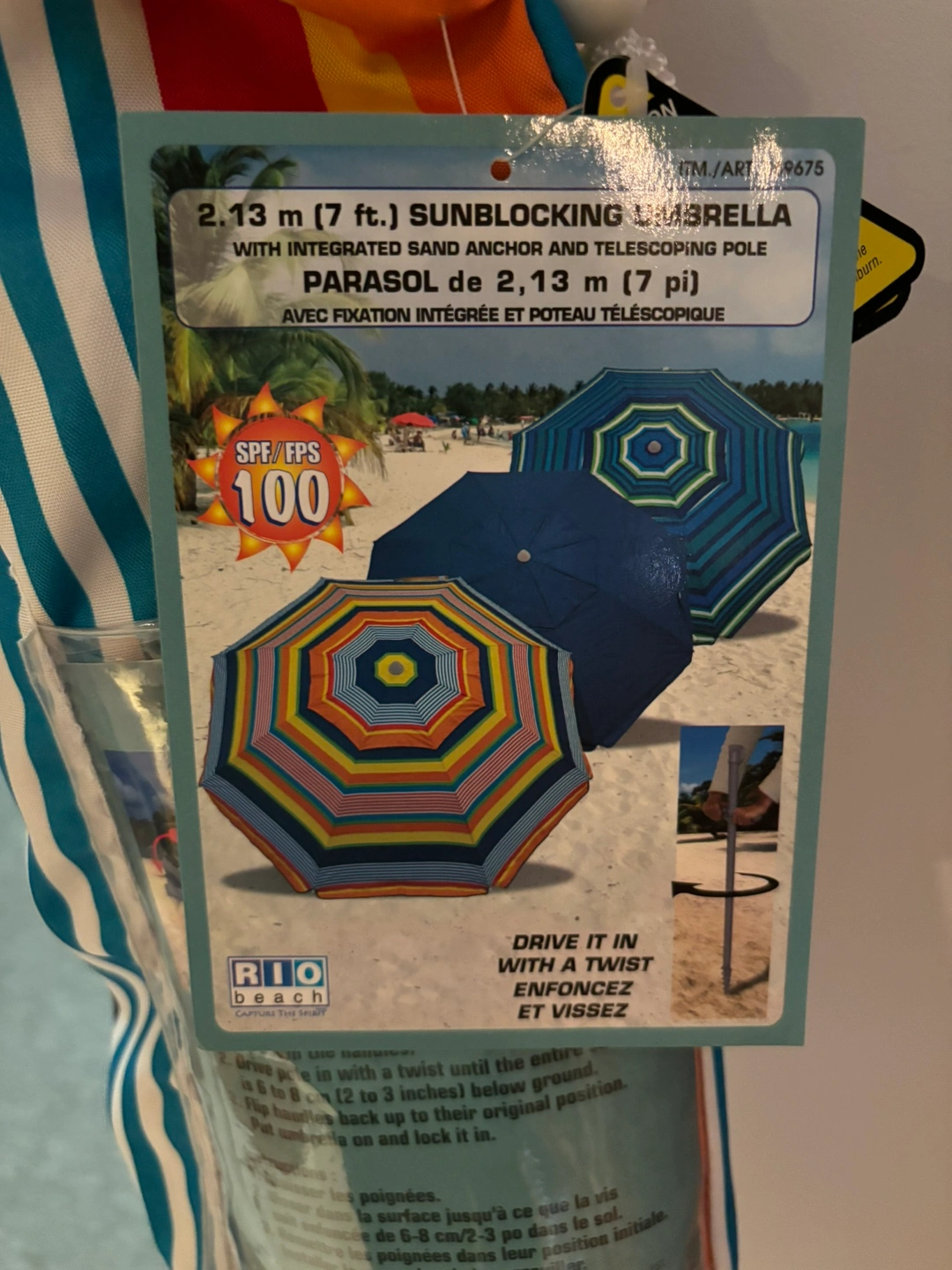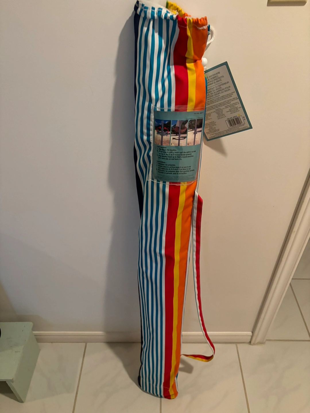 **PRISTINE CONDITION** Still in its original package! Summer’s not over yet! Beautiful multi-striped SUNBLOCKING umbrella. Has intrgrated sand anchor and telescoping pole. Simply drive it into the sand with a twist. Stake out a spot on the beach in style with this umbrella keeping you cool. Online retailers are selling this anywhere from $33 and up. Get this for only $20!