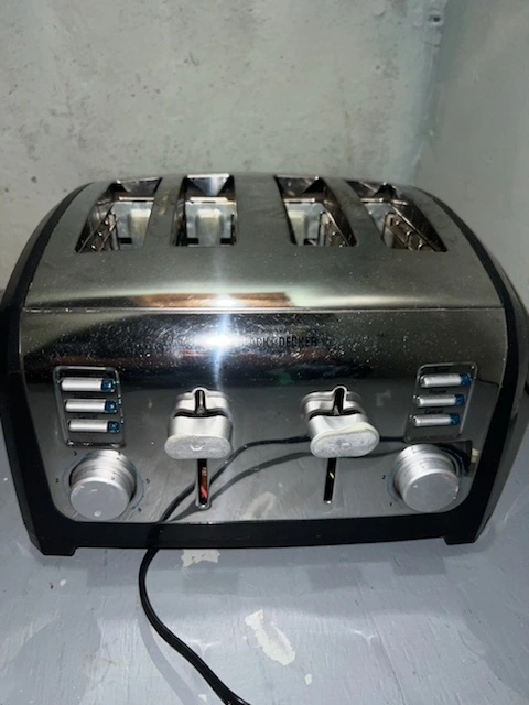 This toaster has four slots for toasting bread. It has a brushed stainless steel exterior with black accents. It has multiple settings and functions for toasting. I bought a toaster oven so I don't need it. Works great. Easy to clean.