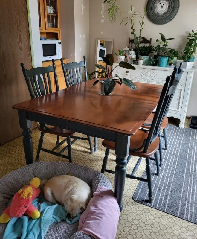 πMade in Canada. Very sturdy, solid wood. Chairs are very comfortable. Will include the foot cozy's with no charge. **A few minor nicks and mark's on table as shown in the photographs above.