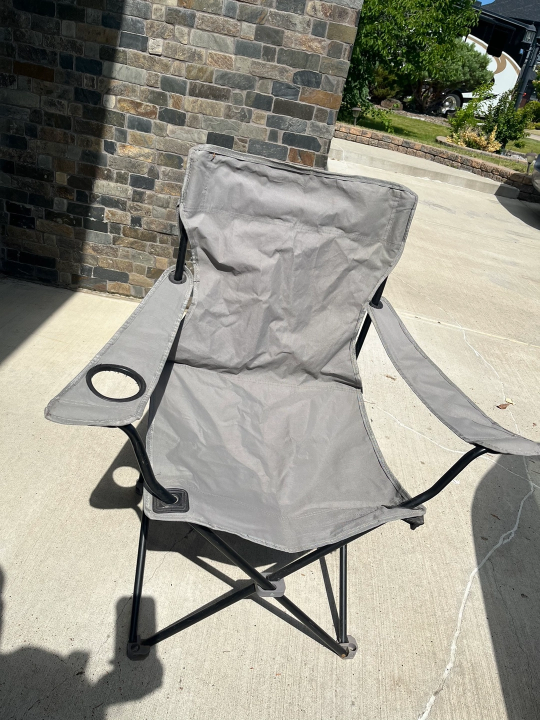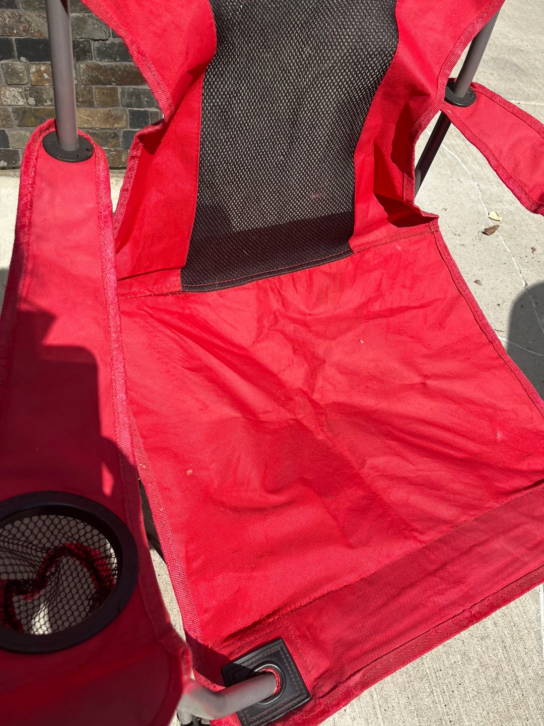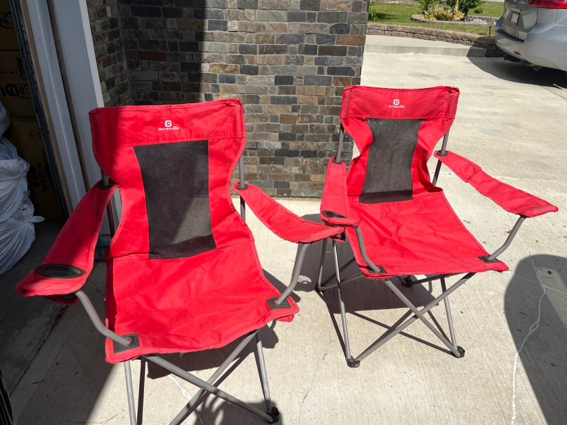 3 folding camping chairs. 2 are red and the other is grey. All chairs have armrests and cup holders (except the grey one). They fold up for easy storage and transport. There is some wear and tear on the red ones as seen in the photos.