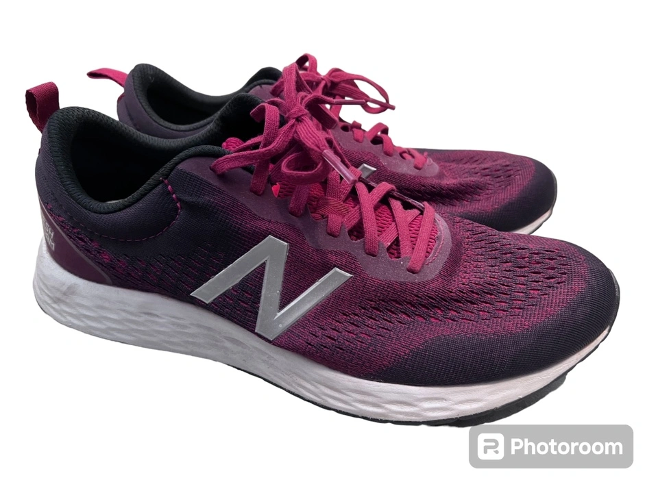These are a pair of New Balance running shoes in Red Wine colour with silver accents. They feature a Fresh Foam midsole. The shoes are in good condition.