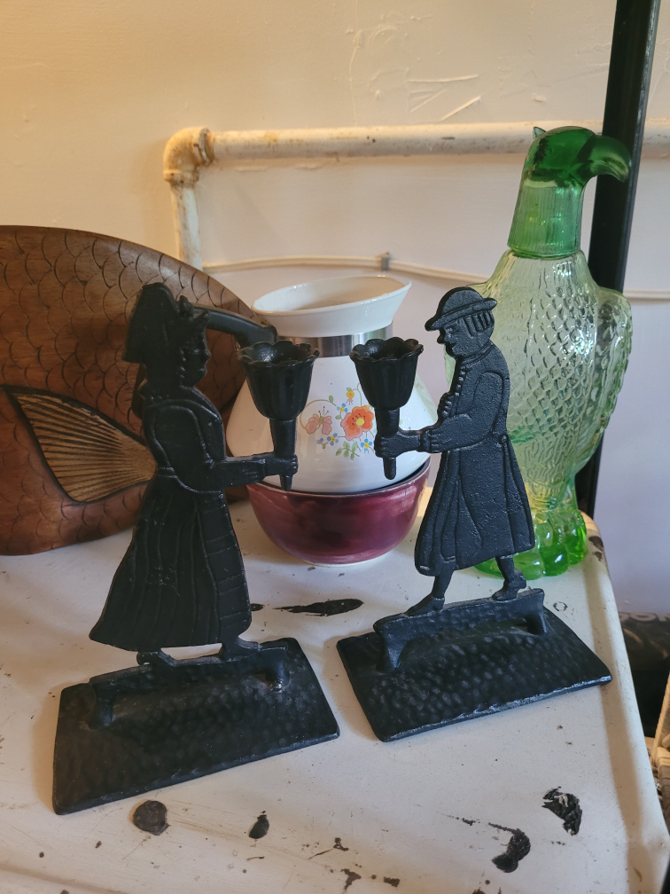 No one is there outside of those times. Pair of cast iron candle holders featuring a man and woman in traditional clothing.