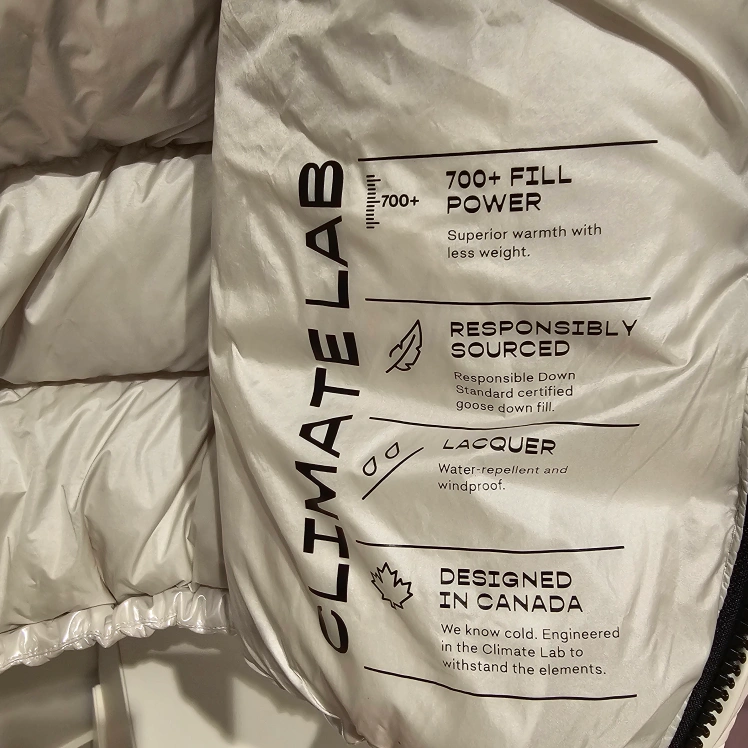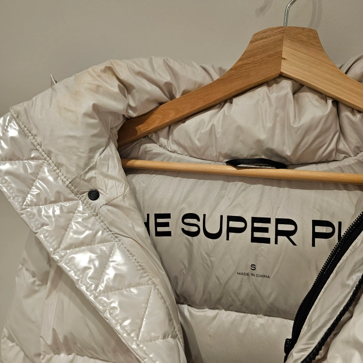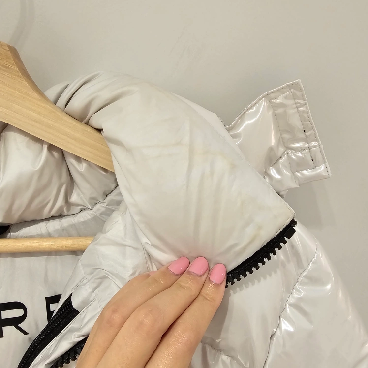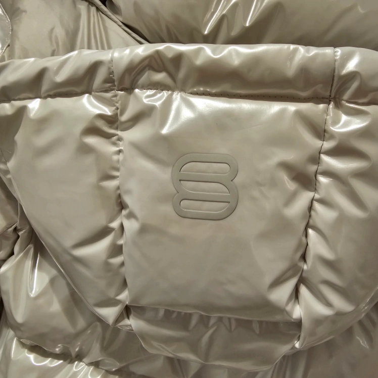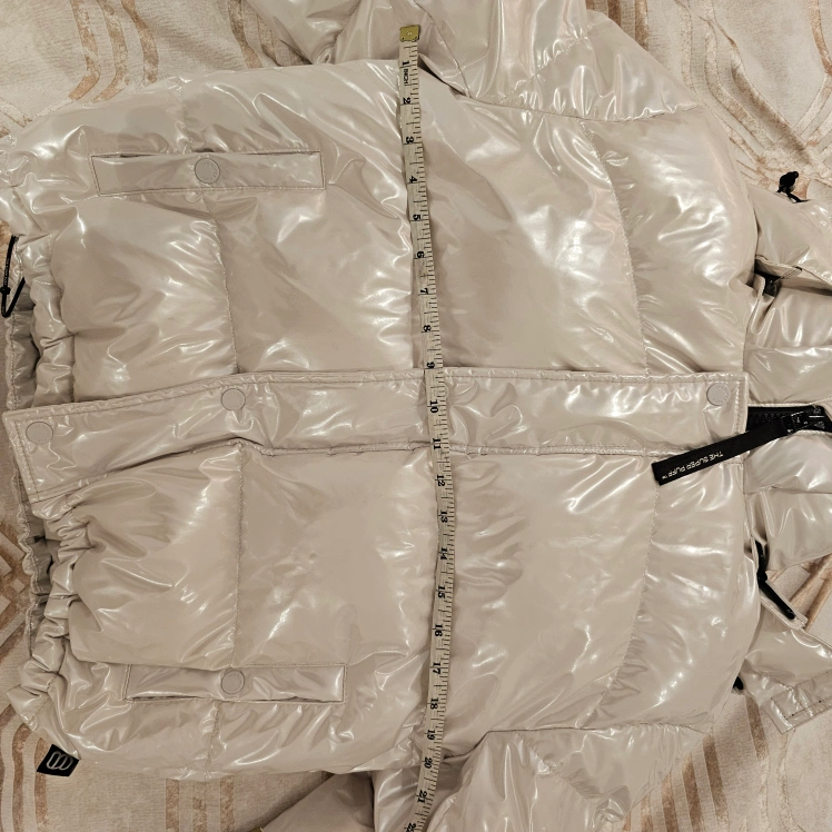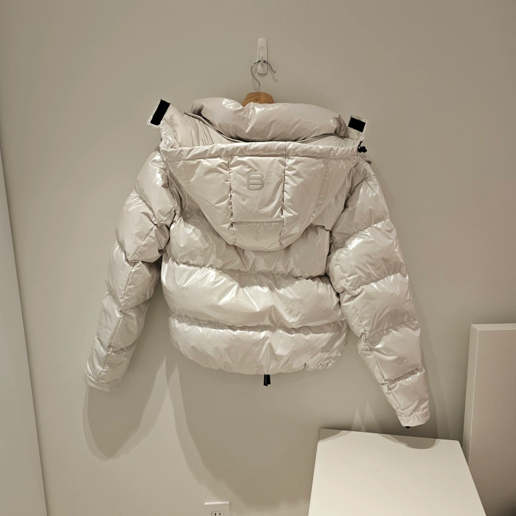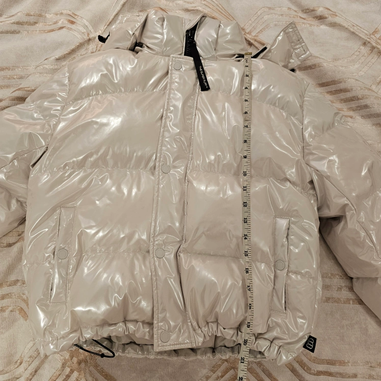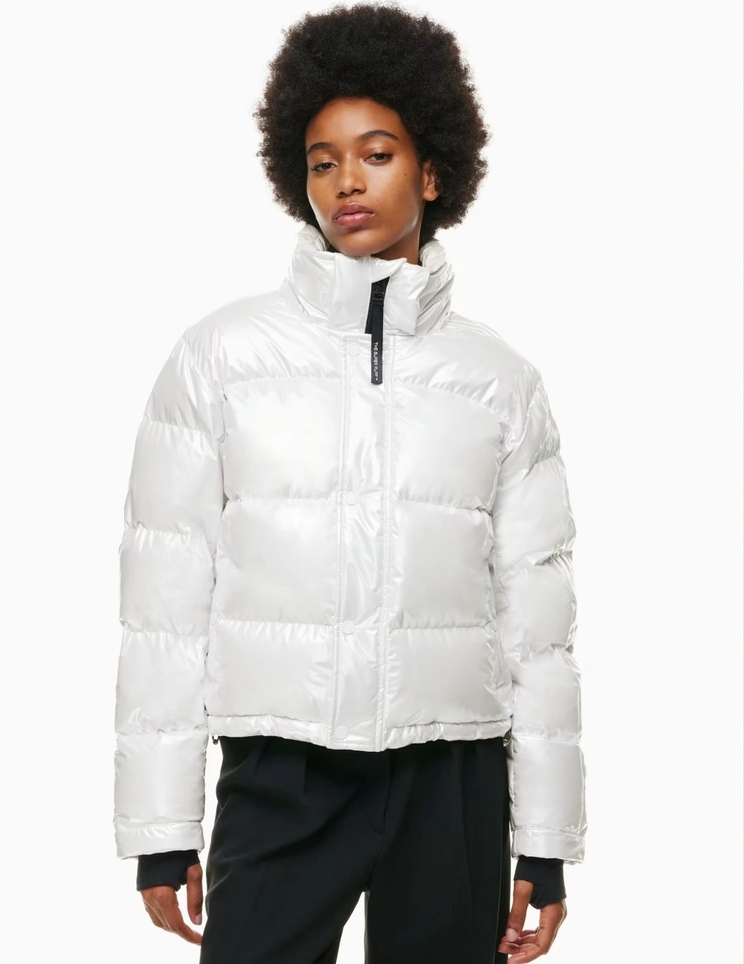 A white puffer jacket with a shiny finish. It has a high collar and a zipper closure. The jacket is cropped and has a drawstring hem. It has two front pockets with button closures.