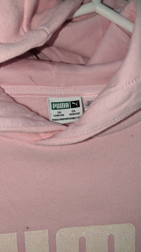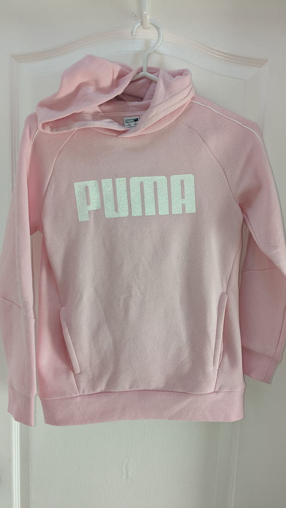 15This is a light pink Puma hoodie with a large white logo. It has a hood and two pockets.