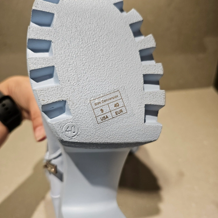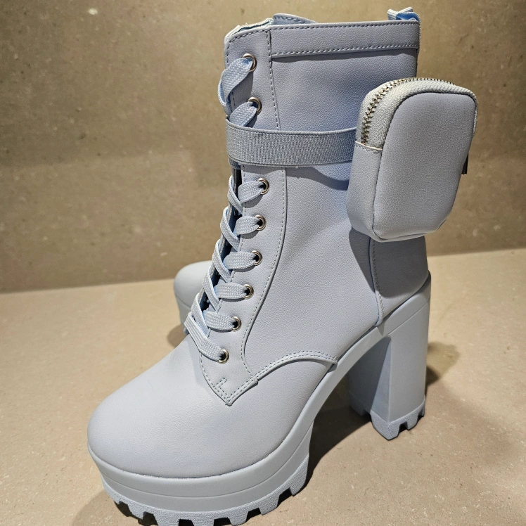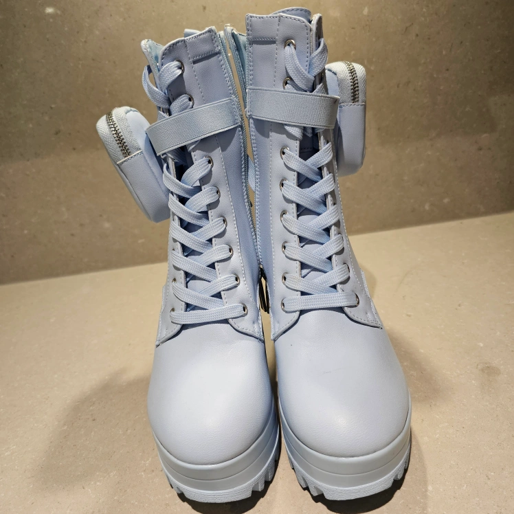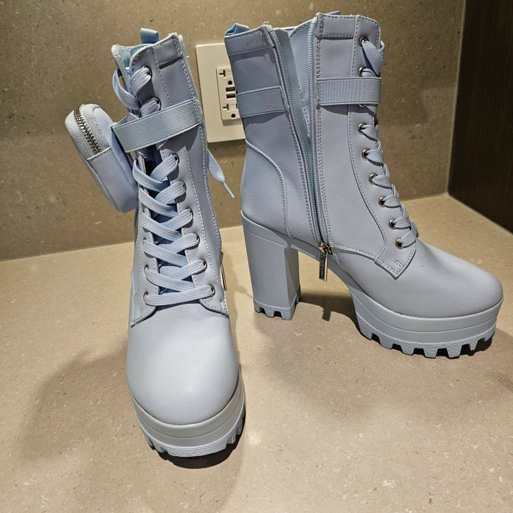 15Size 9 Women's. These are light blue platform boots with a zipper and laces. They have a small pocket on the side of each boot.