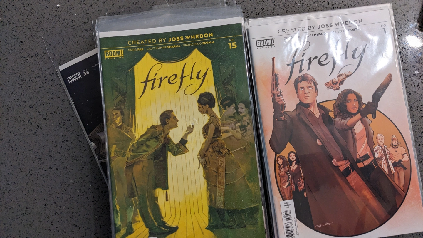 751Firefly (2018) by Pak Issues #1-36 "From Joss Whedon (the visionary creator of Buffy the Vampire Slayer), buried histories and secret identities are revealed, along with all the heist-takin', authority-dodgin', death-defyin' space-cowboyin' you've been missing from your life, as this ragtag crew of mercenaries, outlaws, and fugitives travel the stars in search of their next adventure in these sequels to the hit Firefly television series and Serenity film." "Greg Pak is a comic book writer and filmmaker best known for comic books such as "Planet Hulk," "Action Comics," and "Mech Cadet Yu." He wrote the "Code Monkey Save World" graphic novel and "The Princess Who Saved Herself" children's book, based on the songs of Jonathan Coulton. Pak co-wrote the fan favorite "Incredible Hercules" series with Fred Van Lente, with whom he also wrote the new How-To book, "Make Comics Like the Pros." As a filmmaker, Pak directed the award-winning feature "Robot Stories" and dozens of shorts, including "Happy Fun Room.""