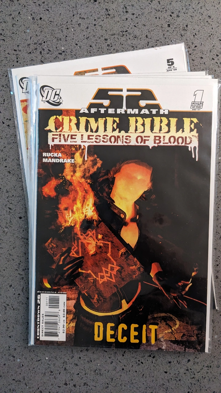 751DC 52 Aftermath Crime Bible the Five Lessons of Blood (2007) by Greg Rucka Issues #1-5 The Question Comic Books "Crime Bible: Five Lessons of Blood is a five-issue limited series about The Question on her path to infiltrating the Religion of Crime in hopes of stopping their acvities for good."