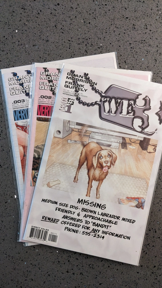 751We3 (2004) by Grant Morrison Issues #1-3 Comic Books "Writer Grant Morrison and artist Frank Quitely deliver the emotional journey of WE3 - three house pets weaponized for lethal combat by the government - as they search for "home" and ward off the shadowy agency that created them. With nervous systems amplified to match their terrifying mechanical exoskeletons, the members of Animal Weapon 3 (WE3) have the firepower of a battalion between them. But they are just the program's prototypes, and now that their testing is complete, they're slated to be permanently "decommissioned," causing them to seize their one chance to make a desperate run for freedom. Relentlessly pursued by their makers, the WE3 team must navigate a frightening and confusing world where their instincts and heightened abilities make them as much a threat as those hunting them - but a world, nonetheless, in which somewhere there is something called "home.""