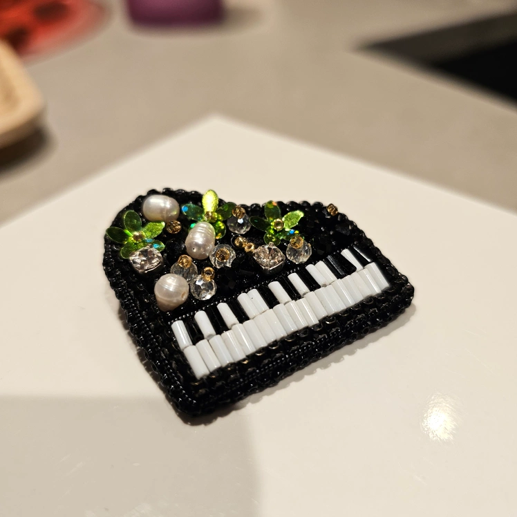 15This is a beautiful brooch featuring a beaded piano design. The piano keys are white and the body of the piano is black. The brooch is embellished with green and silver beads.