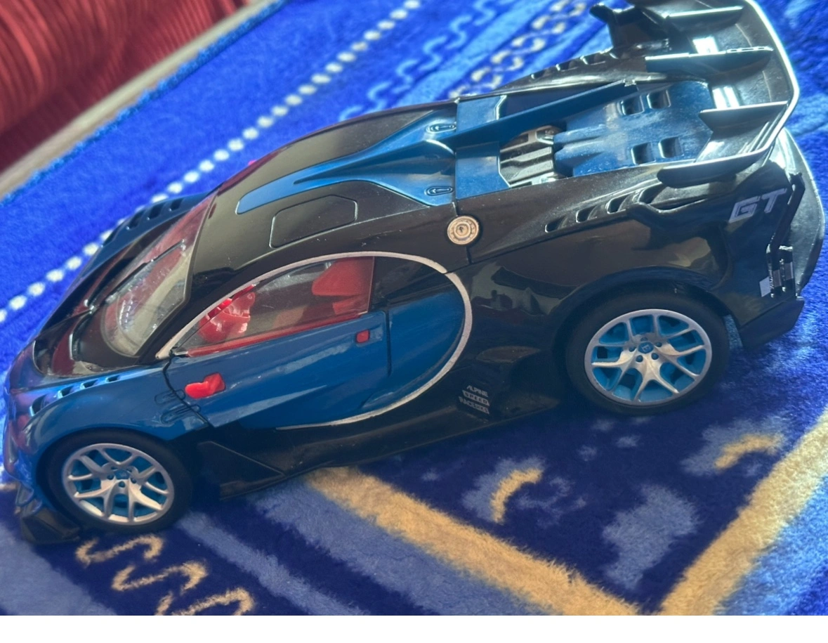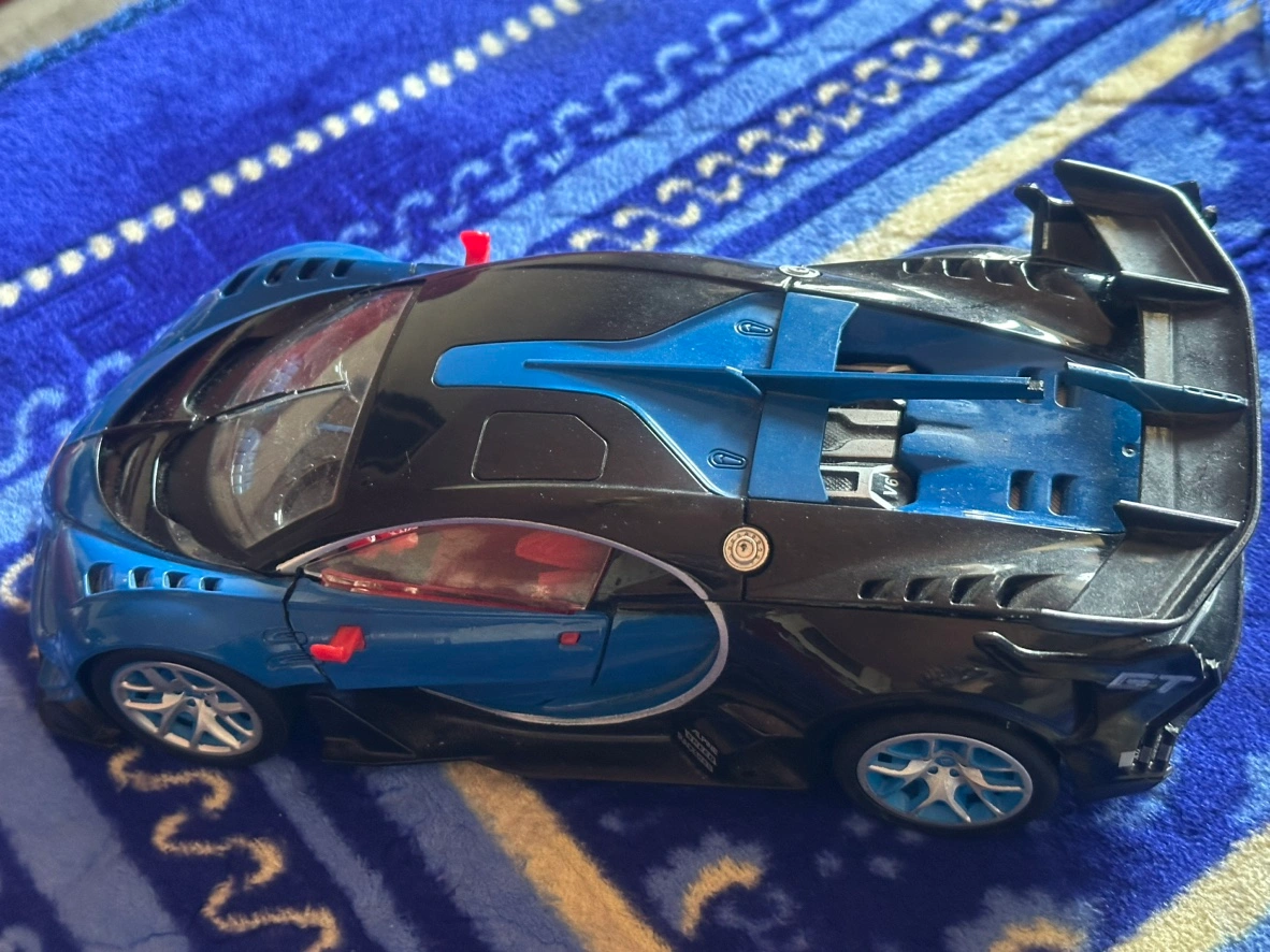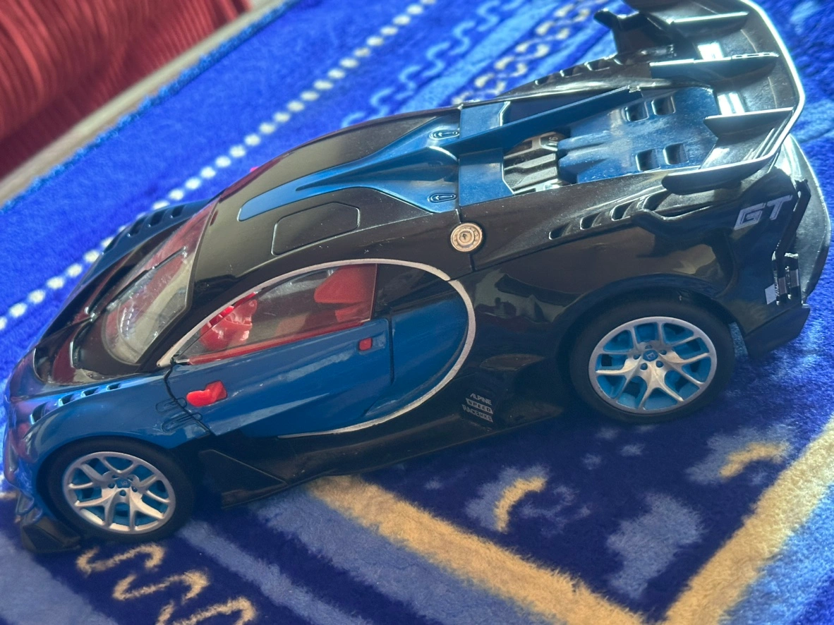 This is a 1/14 scale remote control car in the shape of a Bugatti. It is black and blue in colour. The car is in new condition, still in its original packaging.