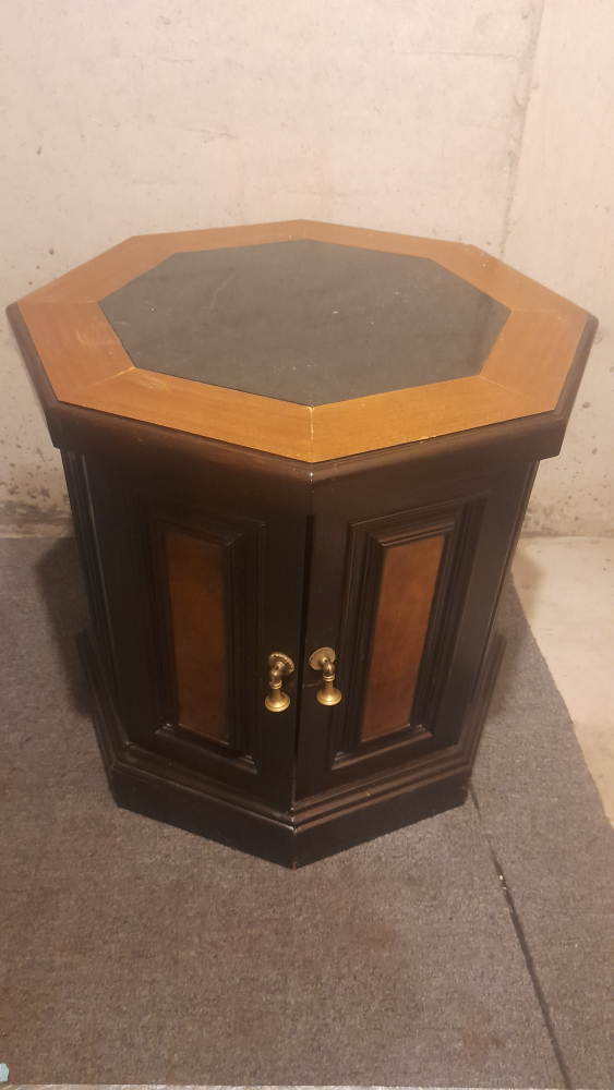 Octagonal end table with glass top and two doors. It is approximately 24 inches in diameter and 28 inches tall.