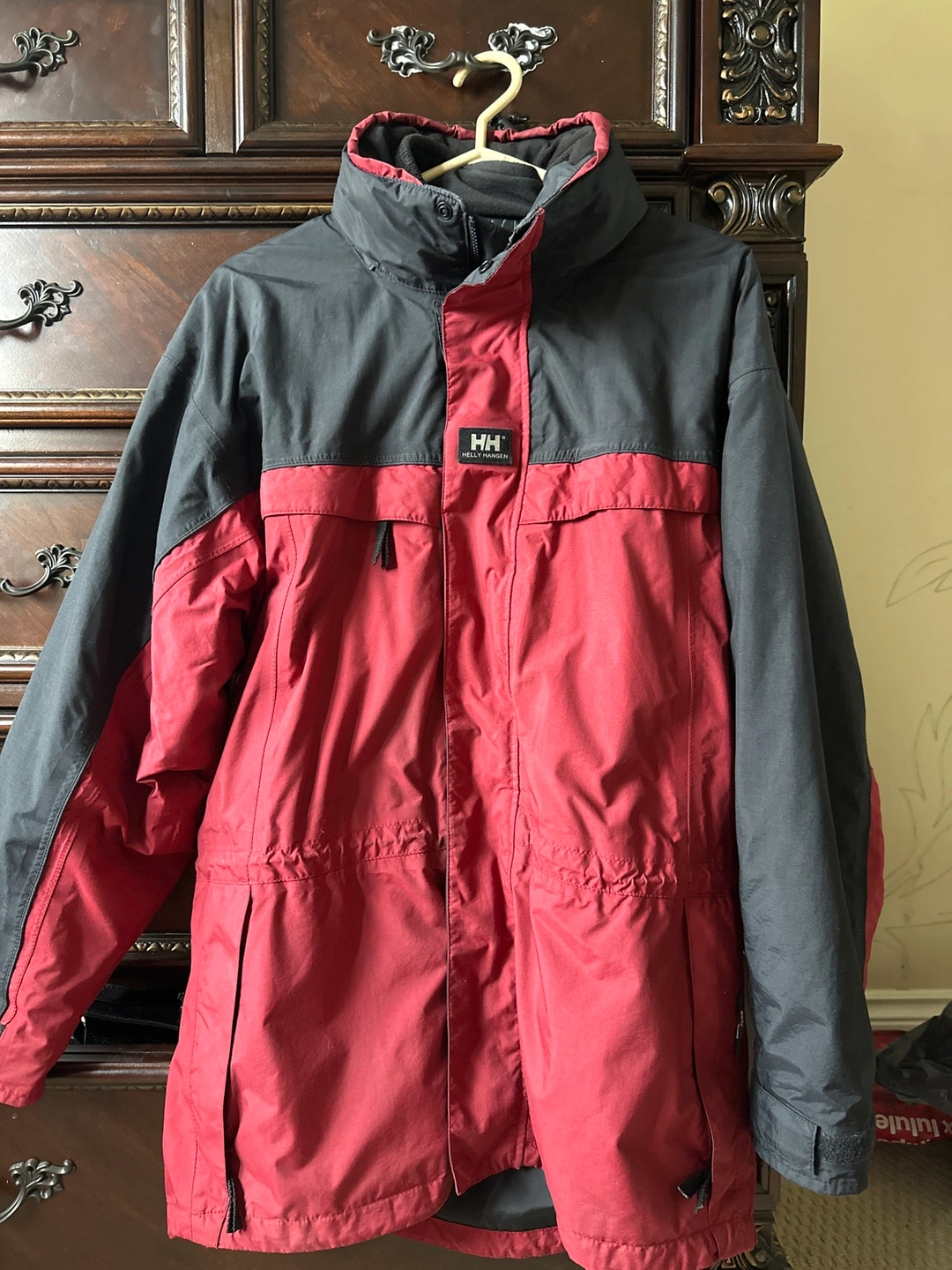 Black & burgundy men's winter jacket with a hidden , removable hoodie ! The jacket has multiple pockets and a zipper closure . Will keep you pretty warmn in winter . Only used few times .