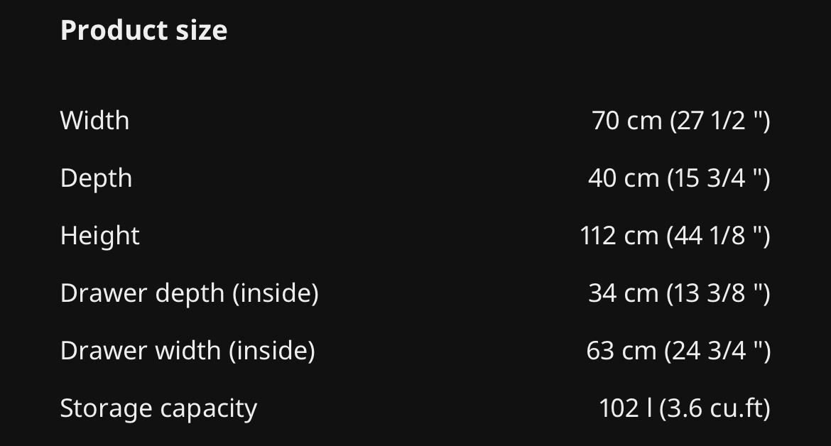 Drawer depth (inside): 34 cm (13 3/8 ")