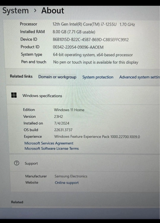 Samsung Galaxy 2 Laptop with Intel core i7(1255U) and iris Xe graphics. 15.6" laptop with 256 GB SSD and 8GB RAM. Barely used, like new expcept for a small wear off the paint in the last picture.