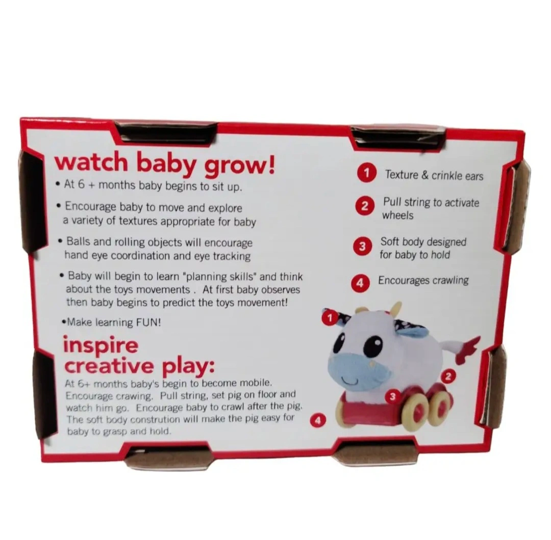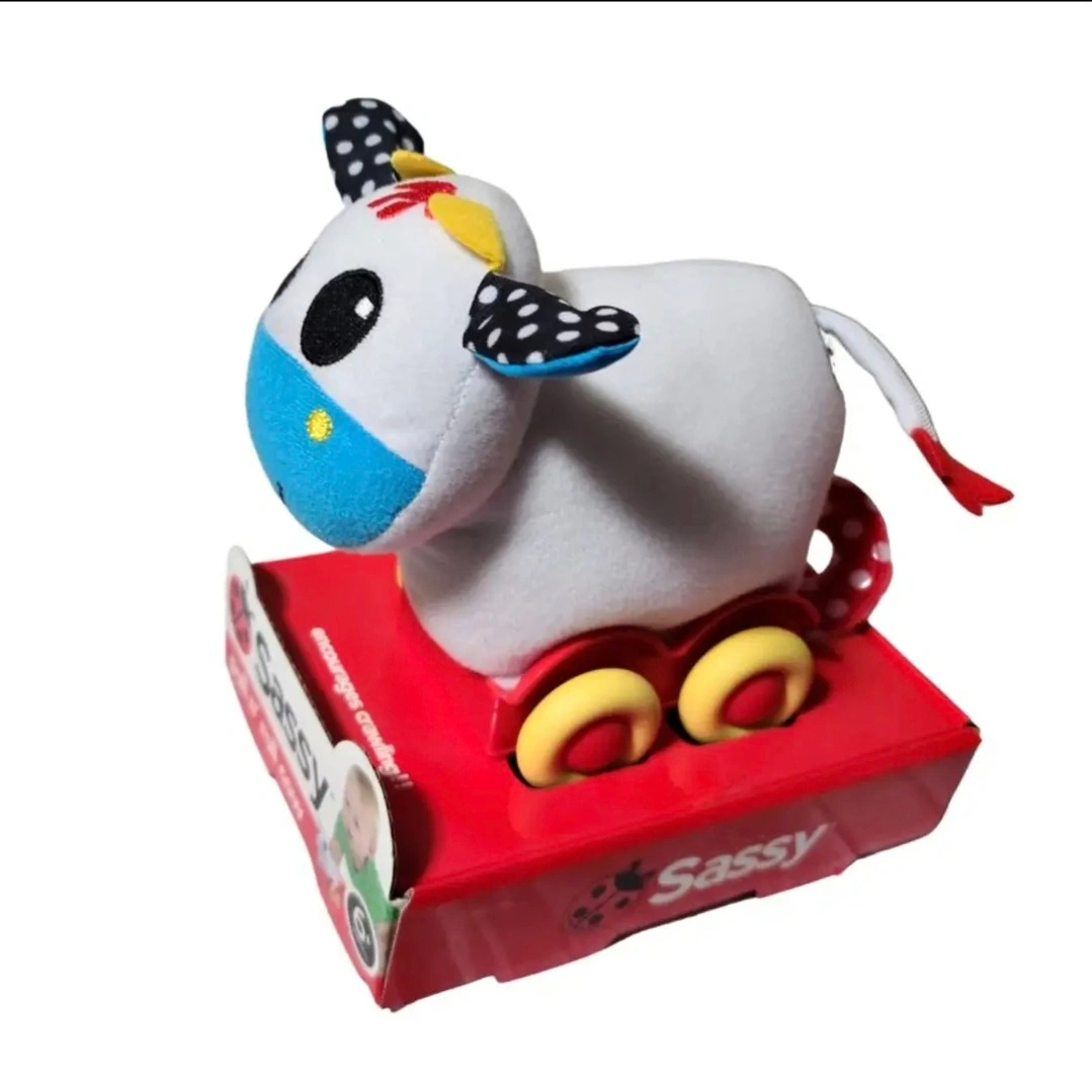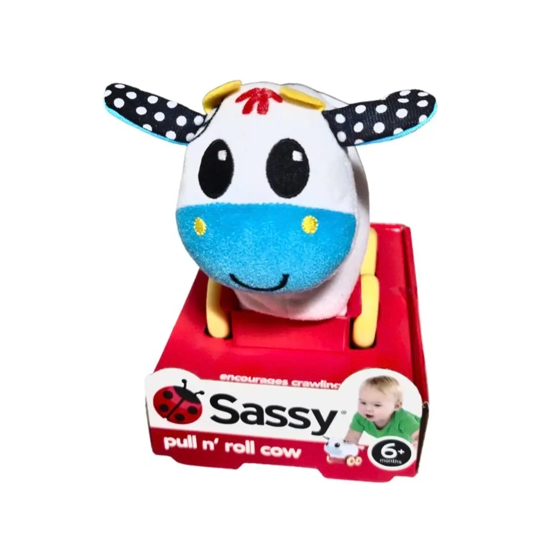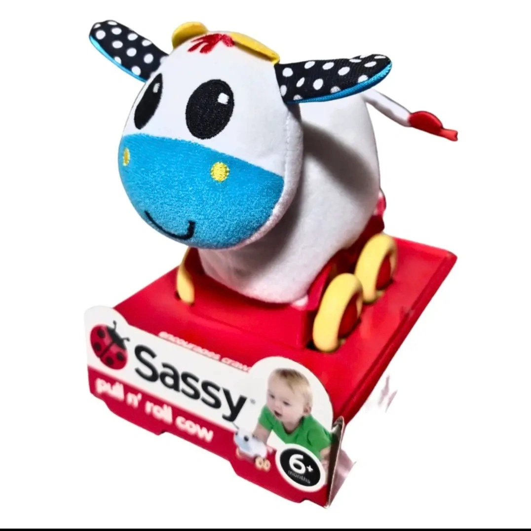 This is a plush Sassy cow on wheels. Pull the cow and it will roll. Encourage crawling! Ages 6 months and up. The toy has a red, yellow and black colour scheme. It has a white body, black and white spots on its ears, a blue face, yellow around its eyes and a red tail. The wheels are yellow and the base of the toy is red.