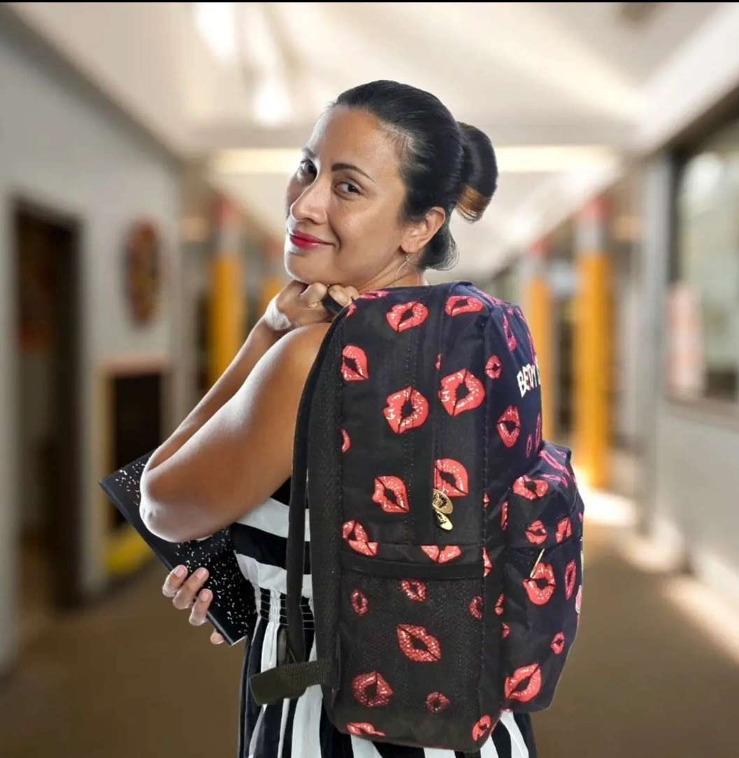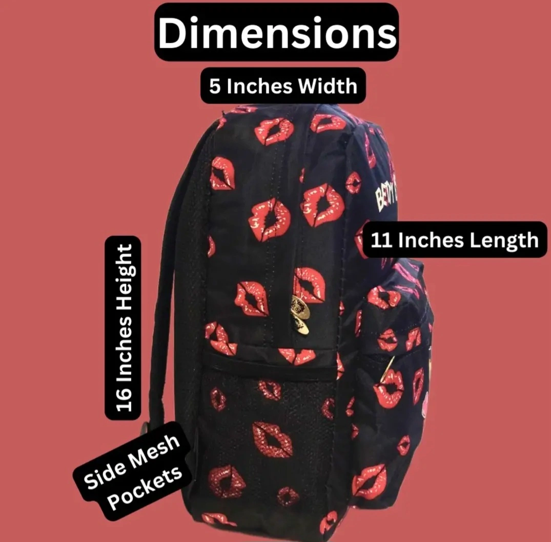 This backpack can be used by girls at primary and high schools. Black backpack with a red lip print and Betty Boop image. It has a zippered main compartment, a front zippered pocket, and two side mesh pockets. It features adjustable shoulder straps and a top carrying handle.