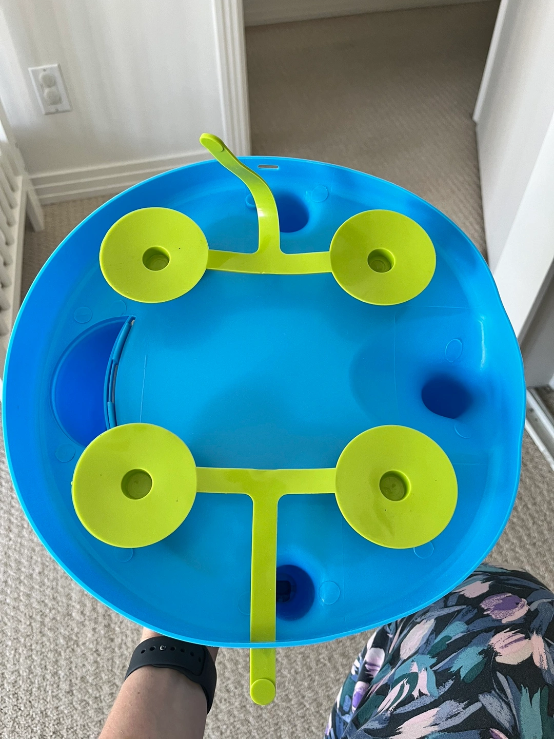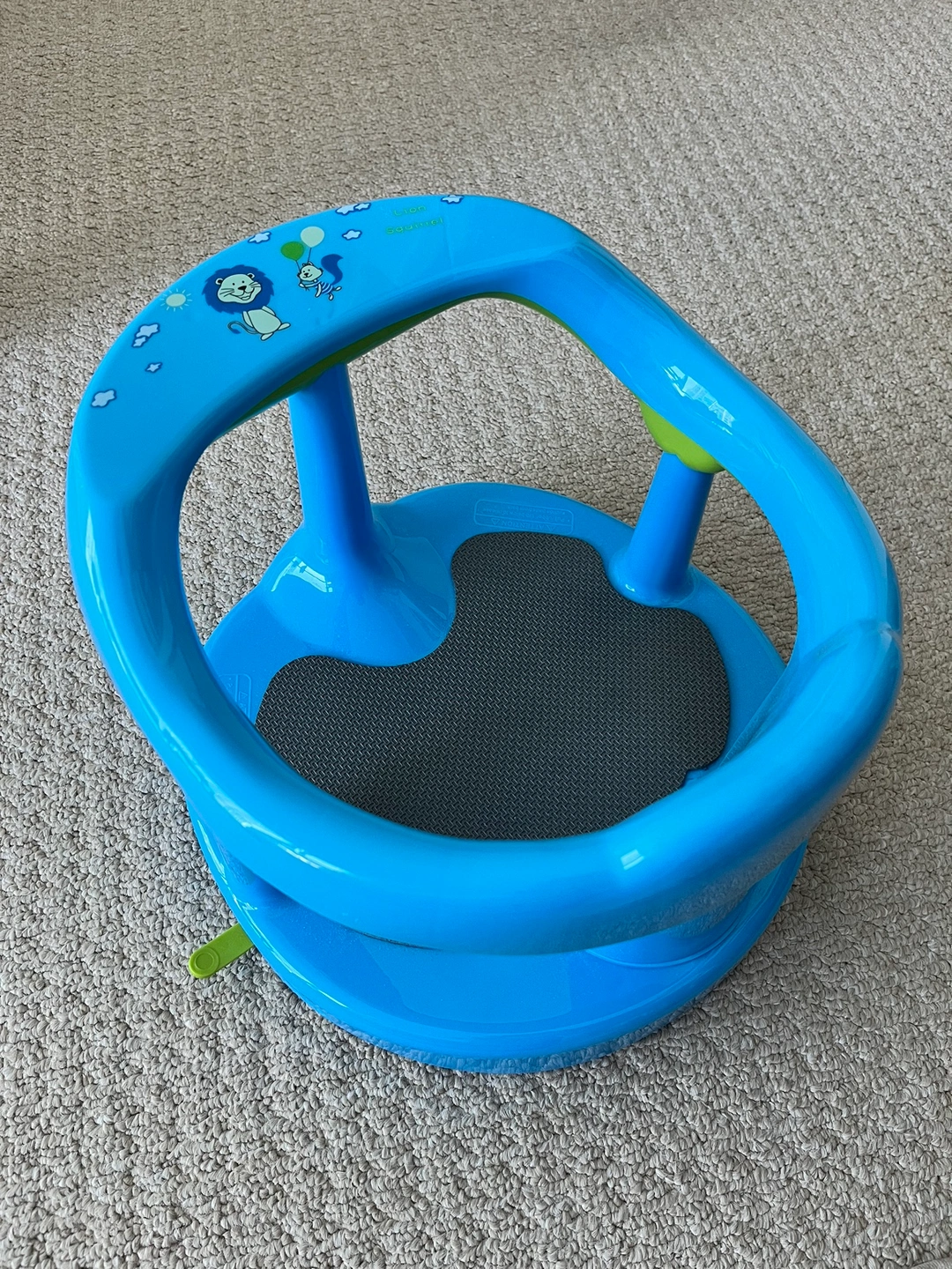 Blue baby bath seat with a green bottom. It has four suction cups on the bottom to secure it in place. Clean, kept dry. New suction cups included. Baby used it handful times and outgrew.
