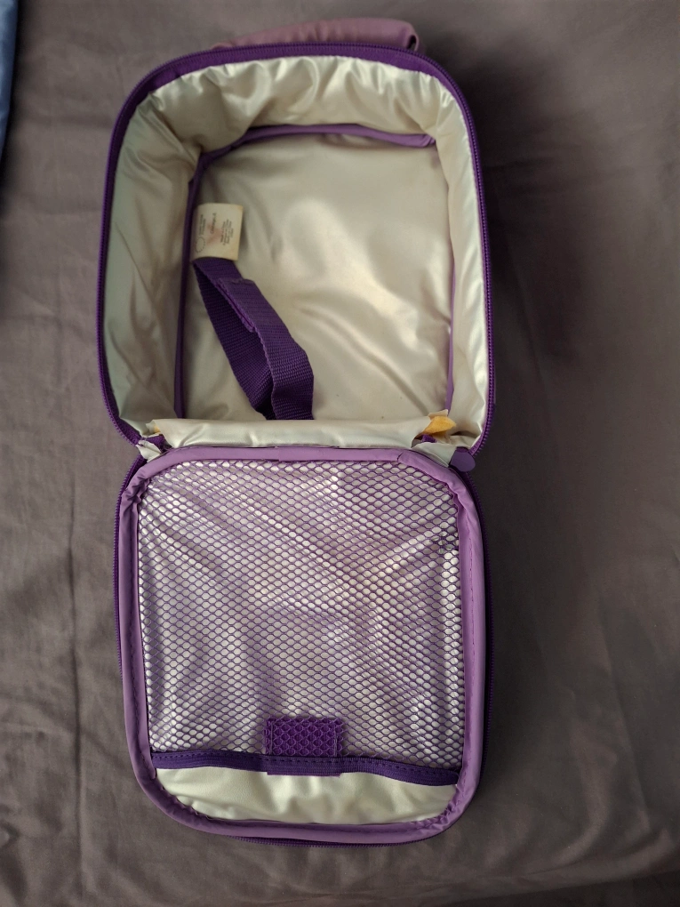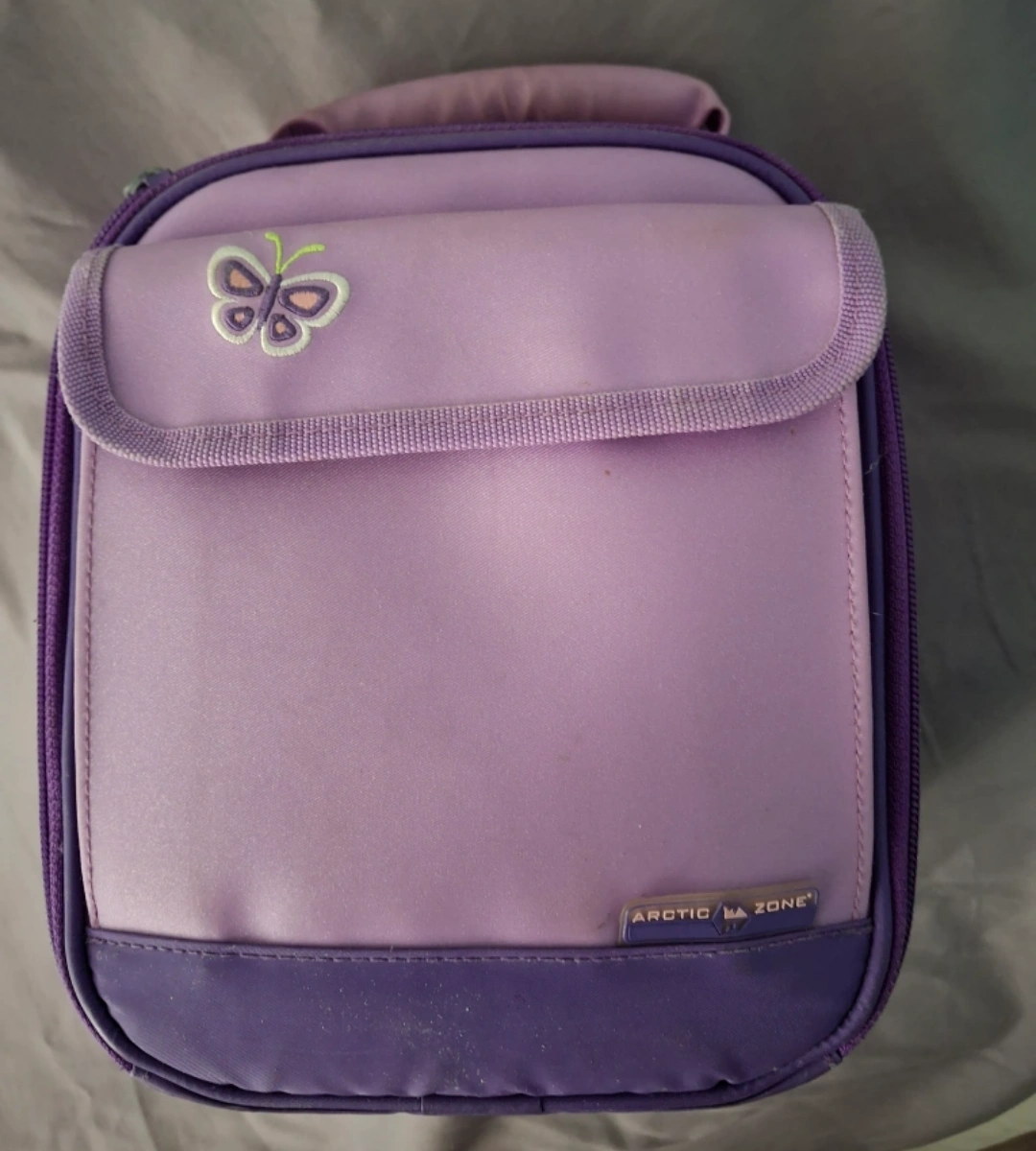 Kid's purple lunch bag with an insulated interior and mesh pocket. There are some small tears on the fabric here and there.