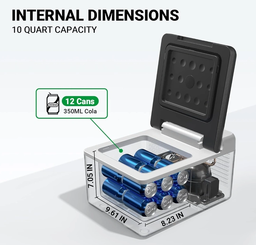 【10 Quart For One Day Trip】Internal Size: 8.23*9.61*7.05 inches. You can use this 10 quart portable freezer as your personal fridge, it can hold up to 12 cans of 12fl oz cola at a time. This mini freezer can meet your day trip or daily dietary needs, you don't have to settle for junk food. The temperature can be adjusted from -4℉ to 68℉, so there is no need to buy ice, never have to worry about soggy food again. NOTE: We do not recommend placing medications in this product.