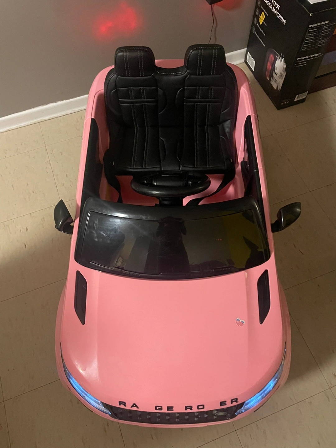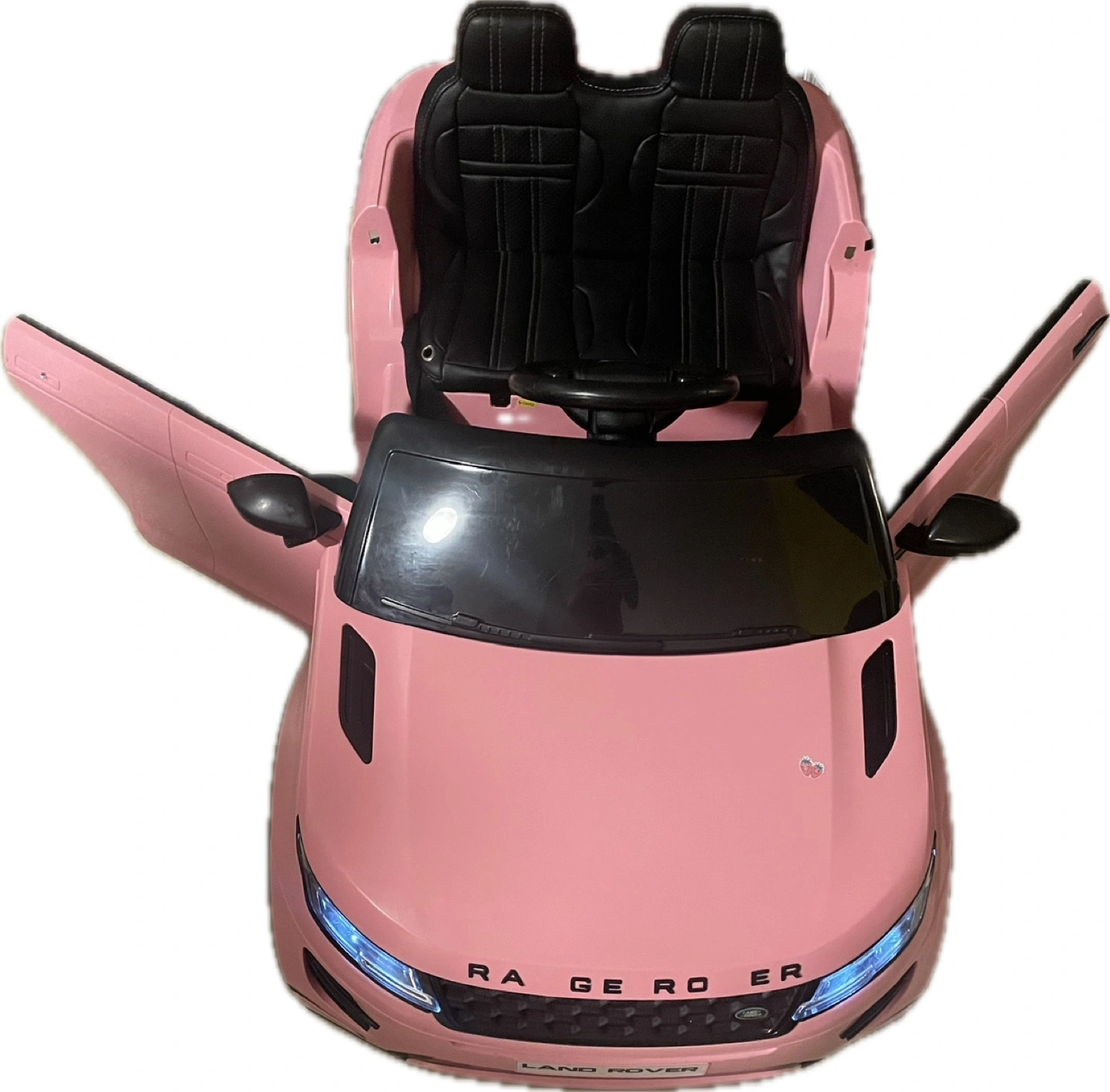 Pink children's ride-on car. Features two black leather-like seats and opening doors. Resembles a Land Rover Range Rover.