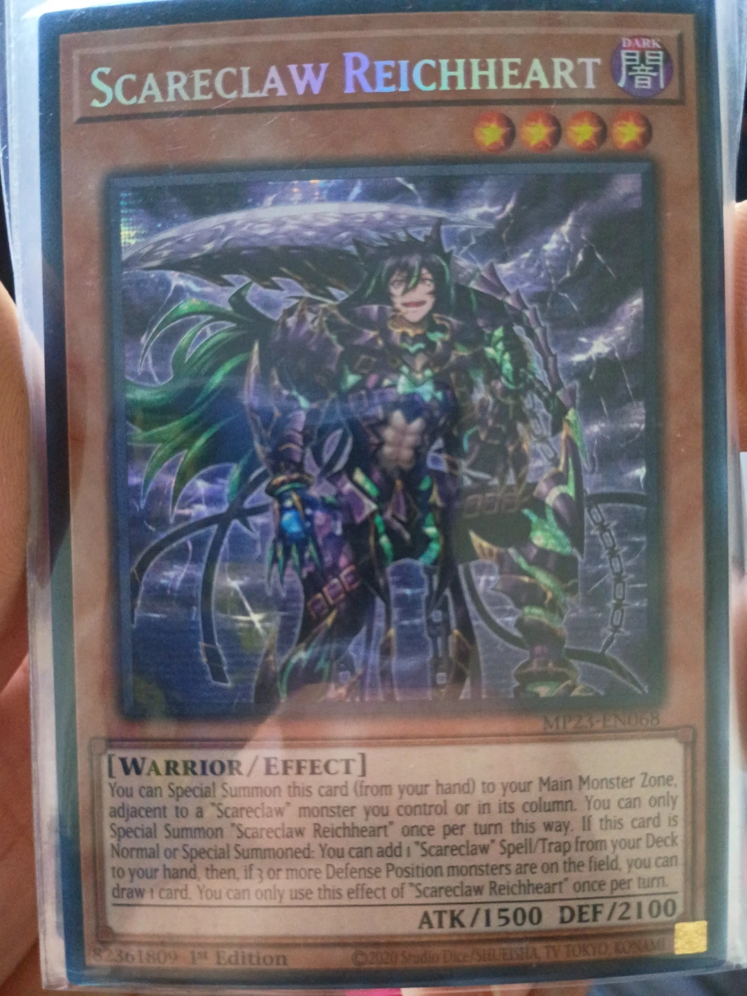 This is the Yu-Gi-Oh! TCG card Scareclaw Reichheart, from the MP23 set. It's a Warrior/Effect monster. ATK/1500 DEF/2100. This card can be Special Summoned from the hand to a zone adjacent to a Scareclaw monster. If Normal or Special Summoned, you can add a Scareclaw Spell/Trap from your Deck to your hand and draw a card if 3 or more Defense Position monsters are on the field.