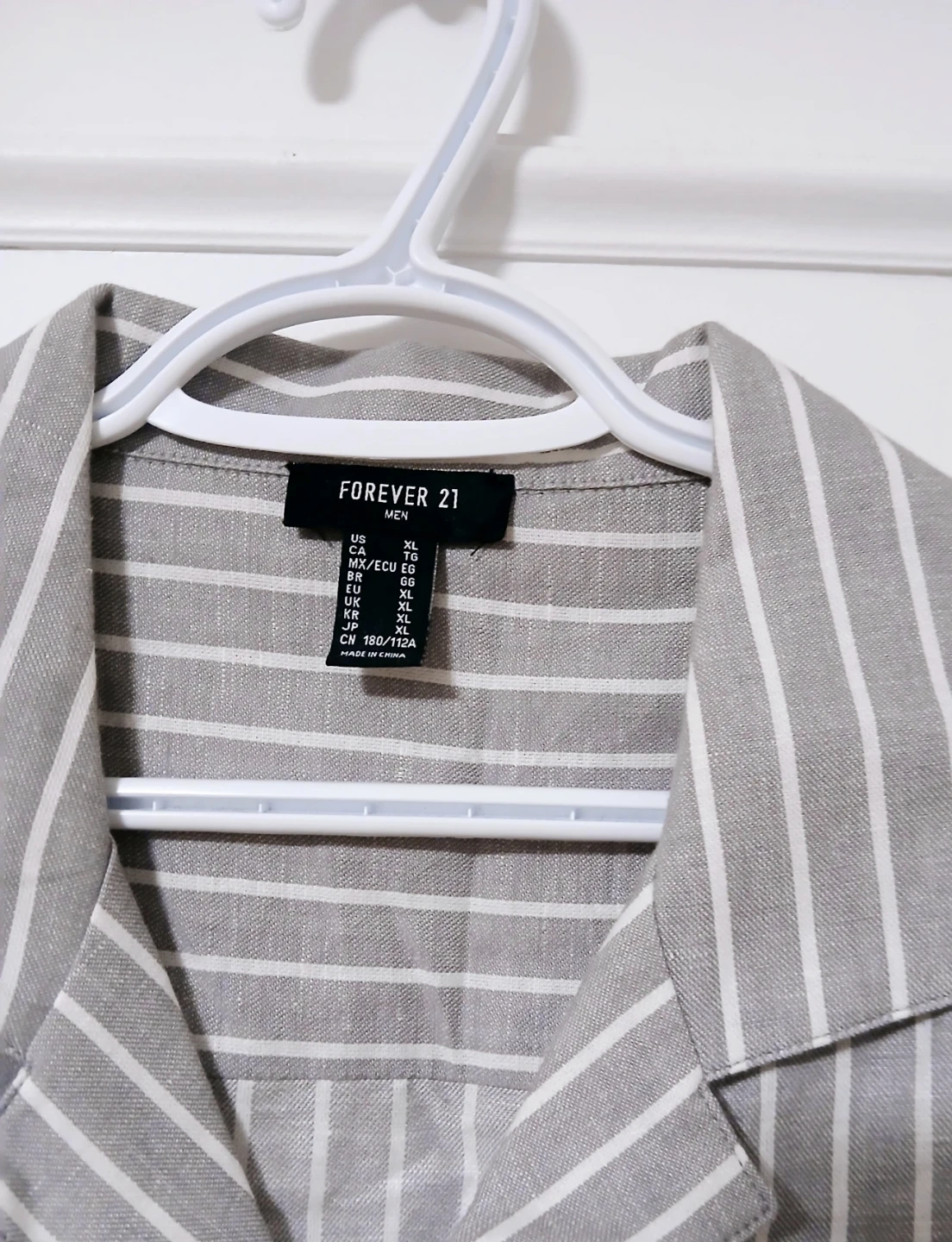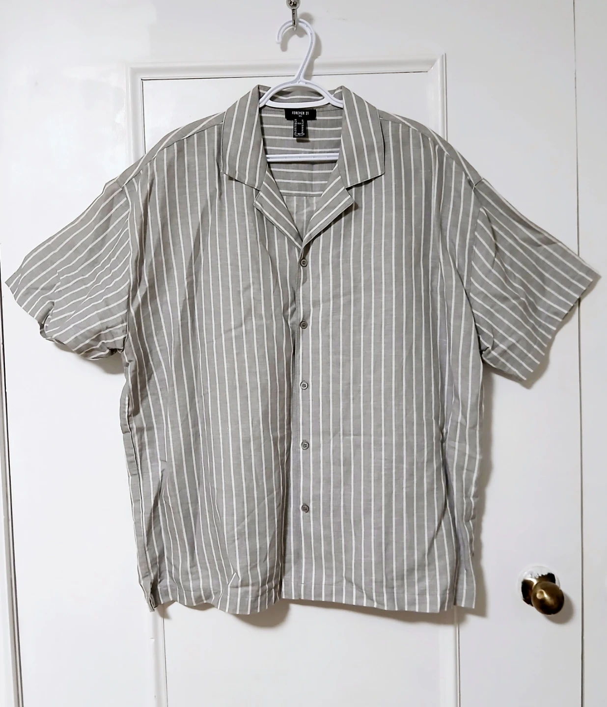 Men's short-sleeve button-up shirt from Forever 21, grey and white stripe pattern, features a relaxed fit with a collared neckline. Size XL. Available for pick up in Meadowvale area, closest intersection Brittania and Glen Erin