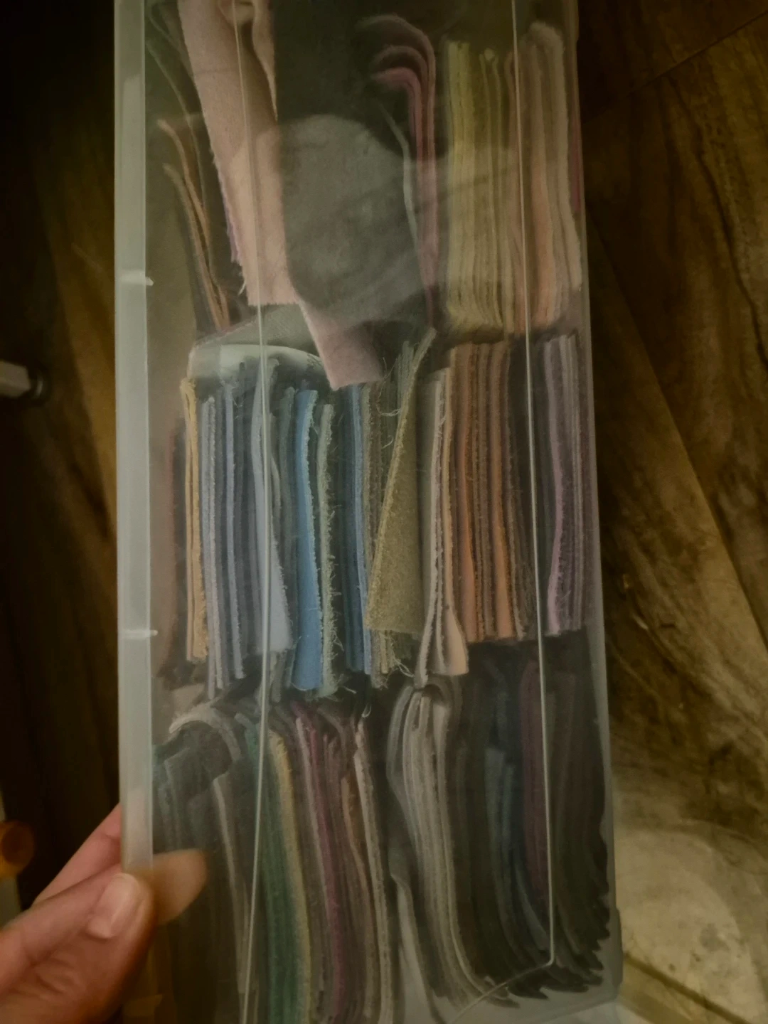 A large collection of fabric swatches in various colours and textures, stored in a clear plastic bin. This assortment includes different materials and shades, perfect for crafting or design projects. The bin helps keep them organized and ready for use!
