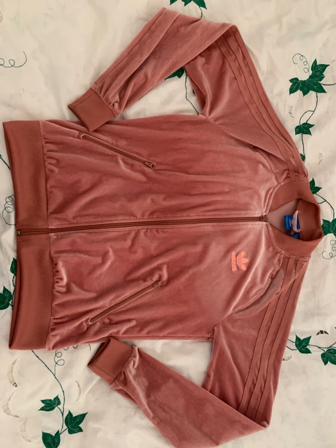 This is an Adidas Originals track jacket. It's made of a soft velvet material and features the iconic three stripes. It's a rose colour and has a full zip closure with pockets.