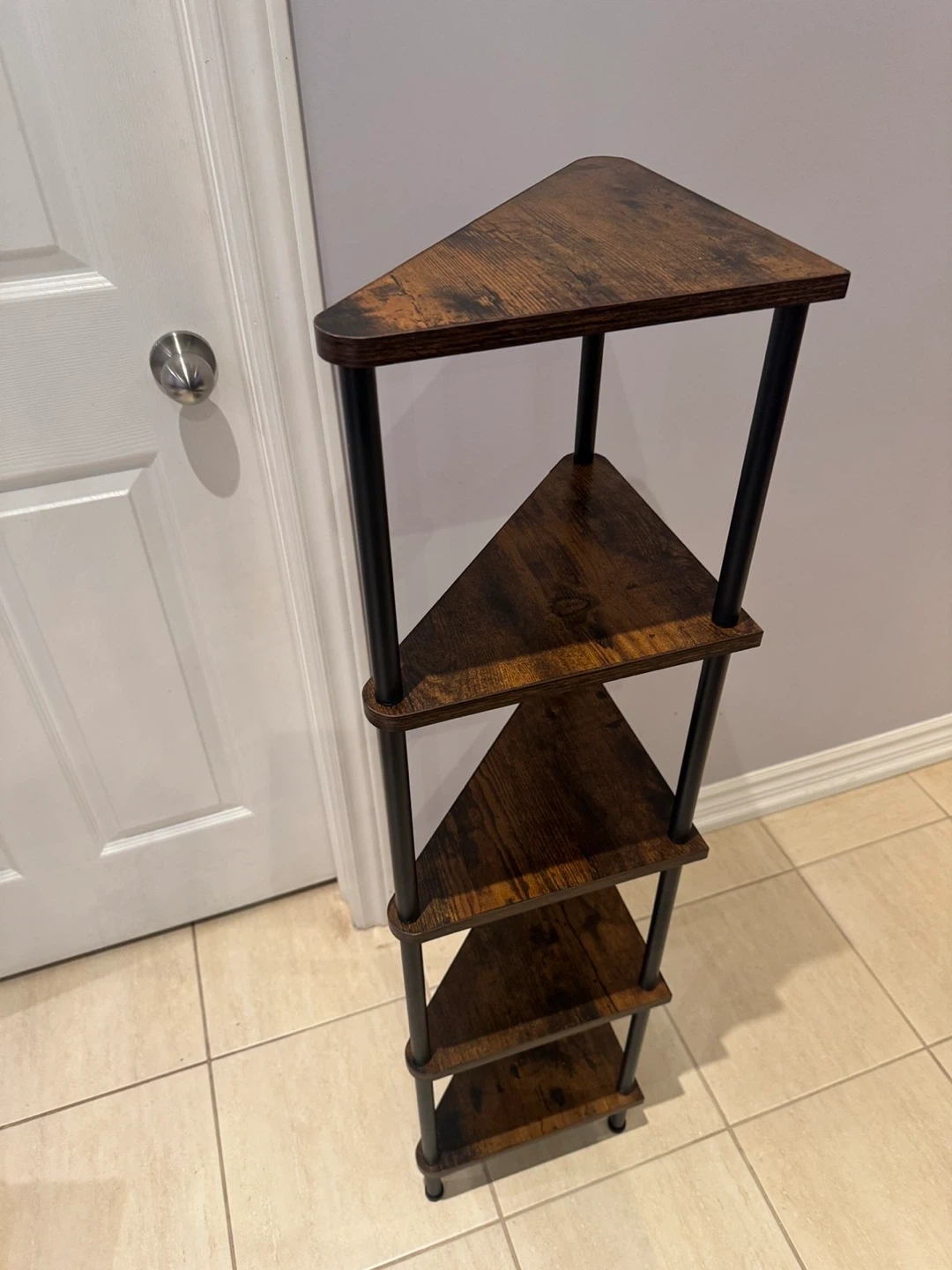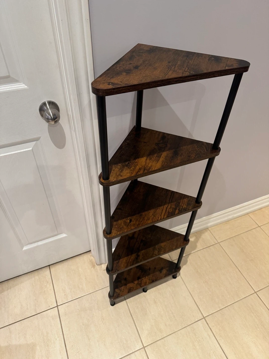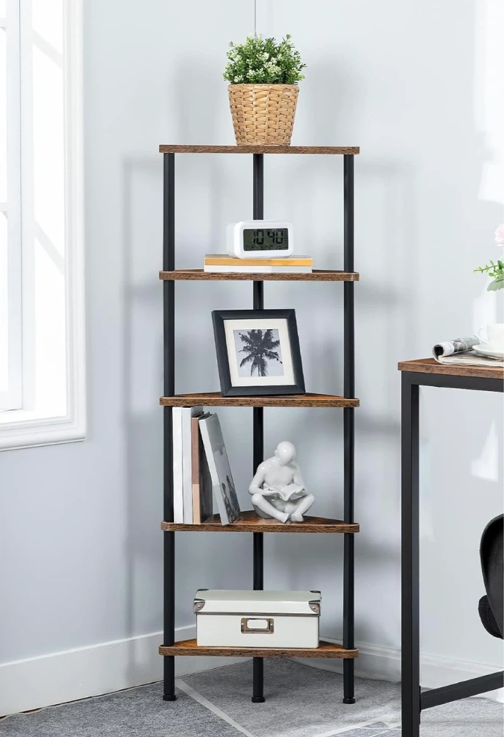 This 5-tier corner shelf unit offers ample storage. It's constructed with a rustic brown finish and black metal legs. This unit is great for maximizing corner space in any room!
