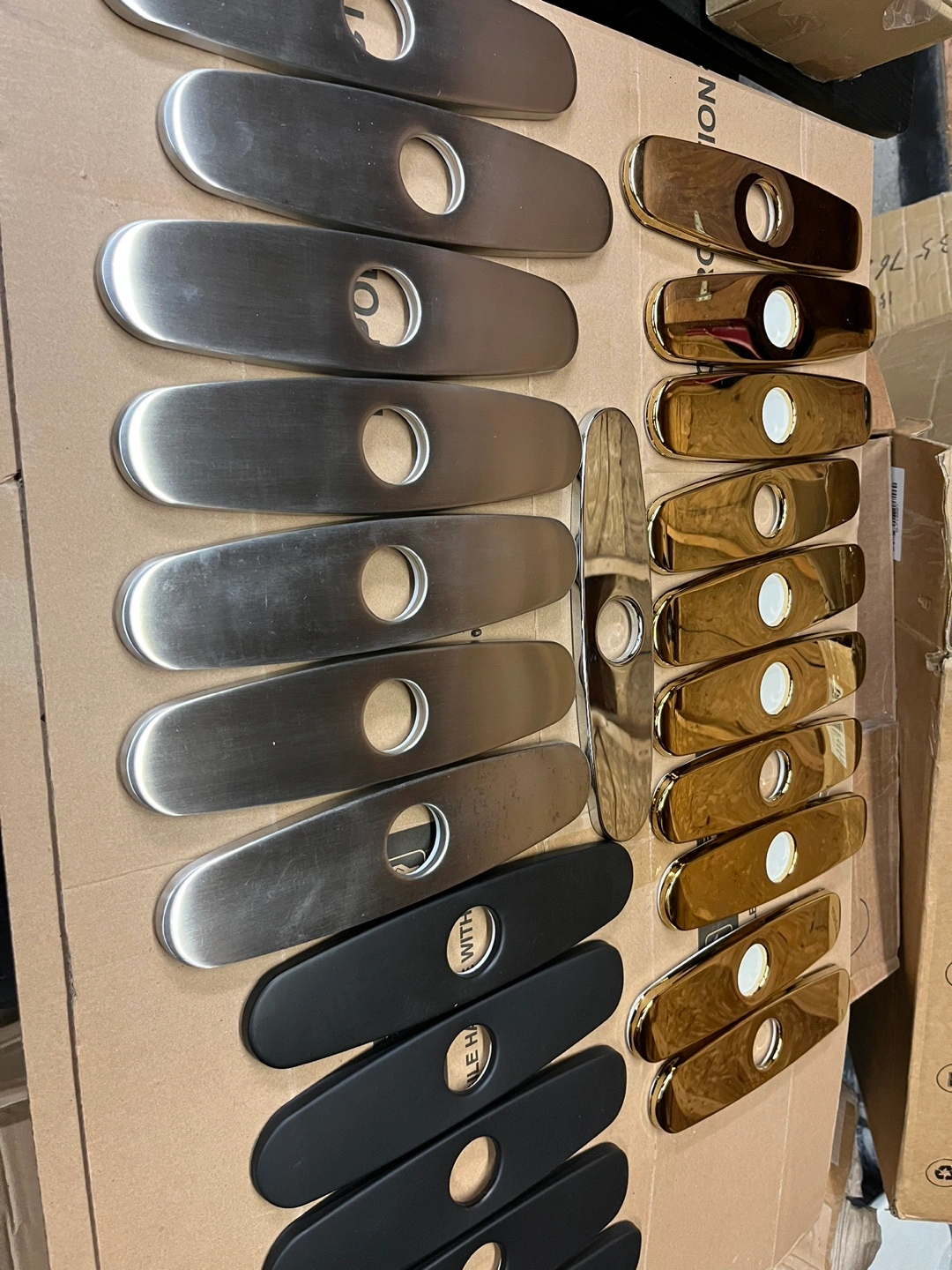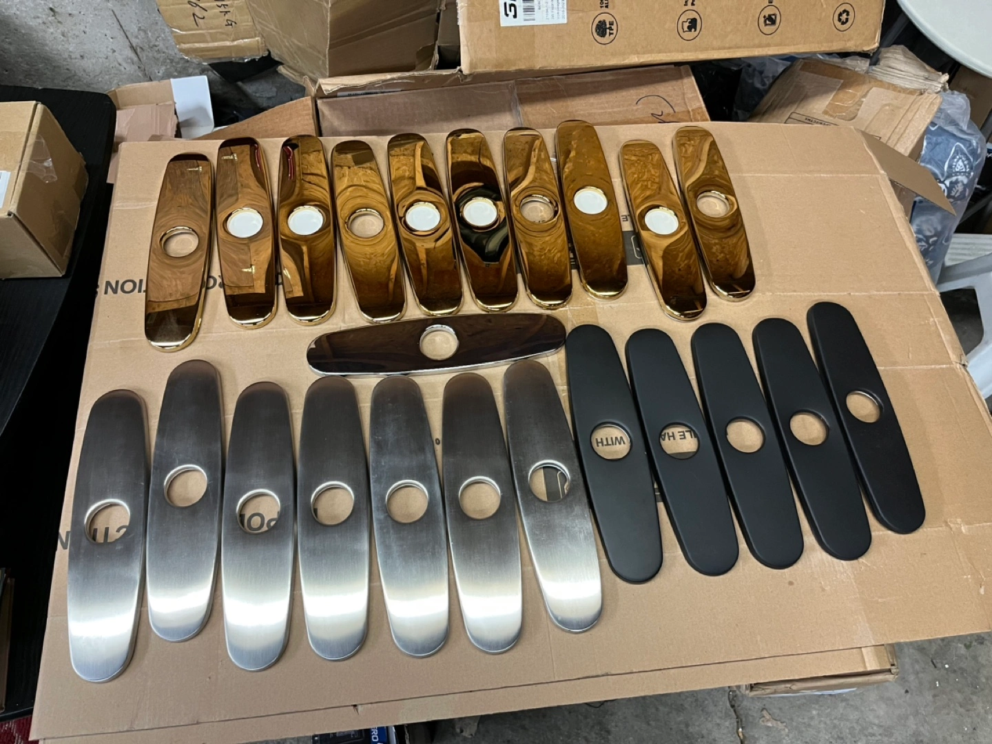 Bulk lot of faucet plate covers. Variety of finishes: gold, brushed nickel, and matte black. Great for renovations or repairs. Sold as a set.