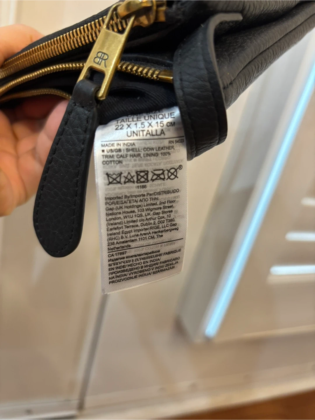 This Banana Republic crossbody bag features a black pebbled leather front and a striking zebra print calf hair panel. It has dual zip top closures and a single adjustable shoulder strap. Made in India, it's 22 x 1.5 x 15 cm.