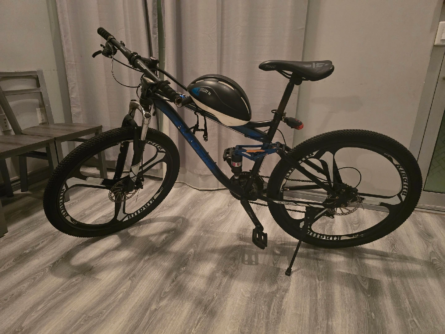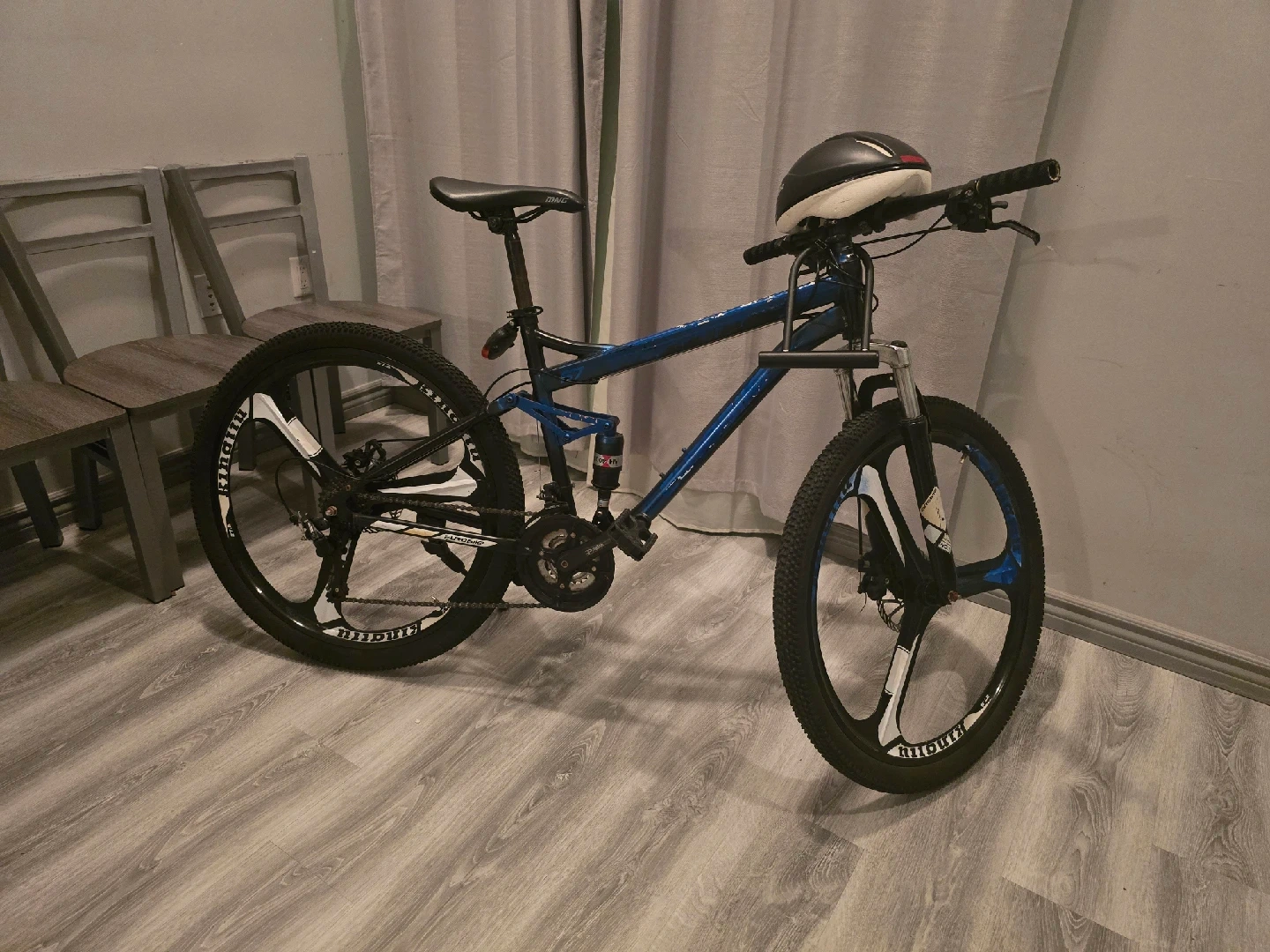 1027.5", Dual suspension, 21-speed, Front and rear disc brakes.. Metal lock and helmet included.