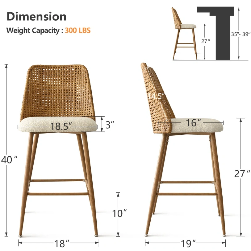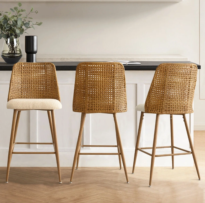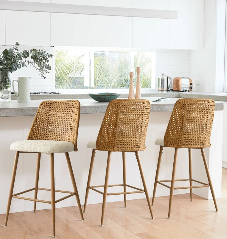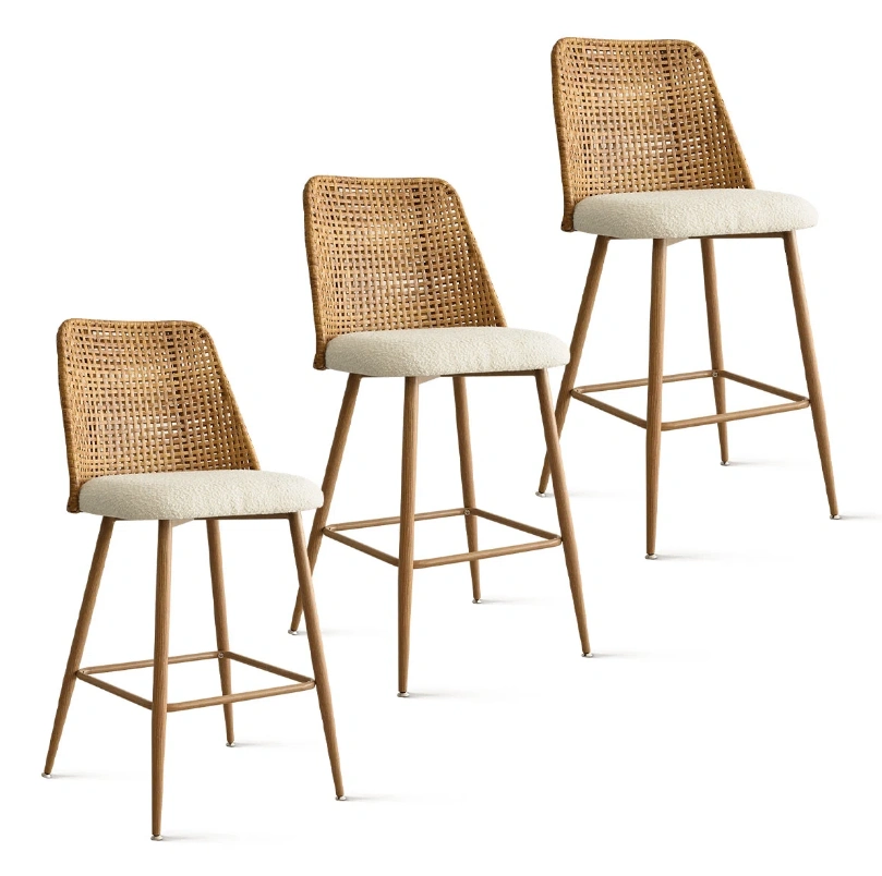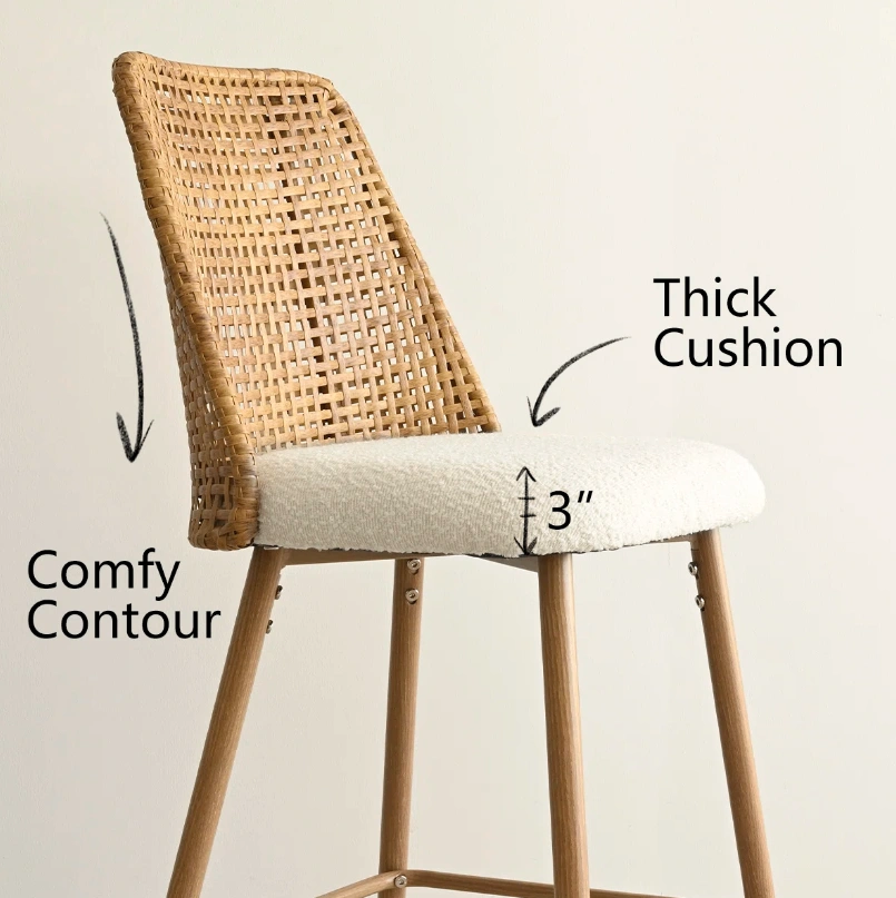 99About This Product Enhance your kitchen or dining area with this three-piece coastal-inspired counter stool set, designed to add a breezy, textured charm. Each stool features a full back adorned with a plastic rattan backrest, blending breathability with stylish allure. The sleek metal legs, finished in a wood-inspired hue, lend a modern touch that perfectly complements any space. Enjoy comfort and coziness with the gently curved chair back and foam-padded seat, upholstered in inviting beige boucle fabric. Whether you're entertaining guests or enjoying a meal with family, these stools offer a comfortable seating option. Practical elements include a footrest for added support and metal glides that protect your floors, ensuring these stools are as functional as they are fashionable. Features Rattan-wrapped frame adds texture and coastal-inspired charm Foam-padded seat and backrest for added comfort Built-in footrest provides support while seated Each stool has a weight capacity of 300 lbs. https://www.wayfair.ca/furniture/pdp/bayou-breeze-briahnna-27-upholstered-boucle-rattan-full-back-counter-stool-set-of-3-c111513431.html?piid=972514038