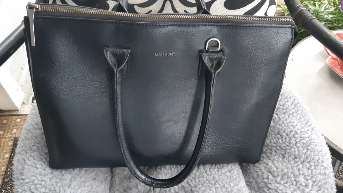 Matt & Nat black leather purse med. to lg size has lg. middle compartment with inside cell phone pocket and a small inside zippered pouch. hardly used excellent condition