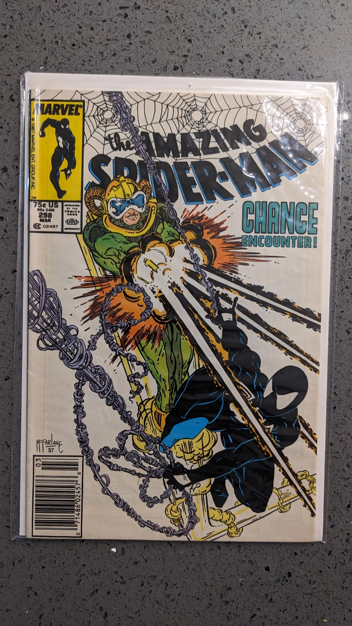 "Newsstand Edition. "Chance Encounter!" Part 1 of 2. Script by David Michelinie. Pencils by Todd McFarlane. Inks by Bob McLeod. Cover by Todd McFarlane. Chance is back in business and working a new job for the Life Foundation! The clandestine organization wants Chance to steal an arms shipment coming into the west side docks! That should be a piece of cake for the high-flying mercenary! However the Daily Bugle dispatches an undercover photographer to observe the delivery! And beneath the moonlit sky, fireworks explode when Chance and the Amazing Spider-Man throw down on the docks! First appearance (and cameo on the last page) by Eddie Brock (aka Venom). First appearance of Carlton Drake of the Life Foundation. Cameo appearances by Mary Jane Watson, Joy Mercado, and Joe Robertson. (Notes: Chance previously appeared in Web of Spider-Man 15. This issue begins Todd McFarlane's 2-year run as the penciler of the Amazing Spider-Man series.)"